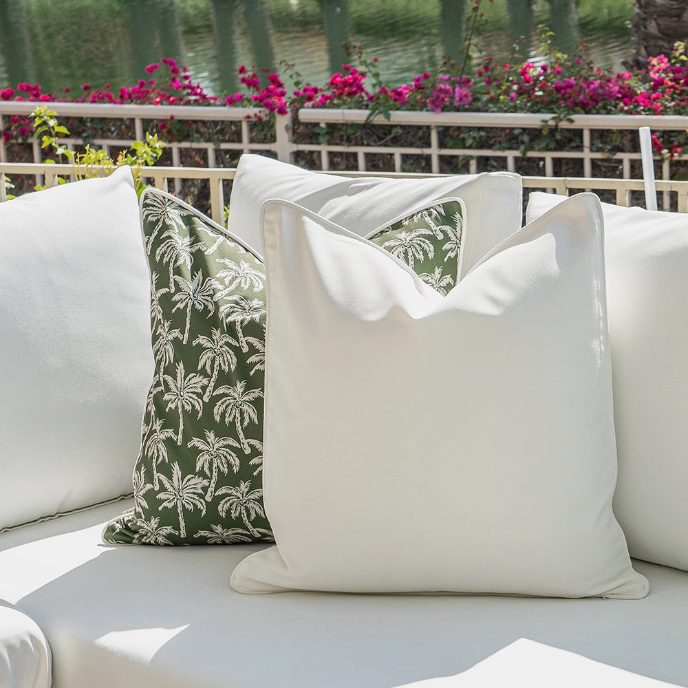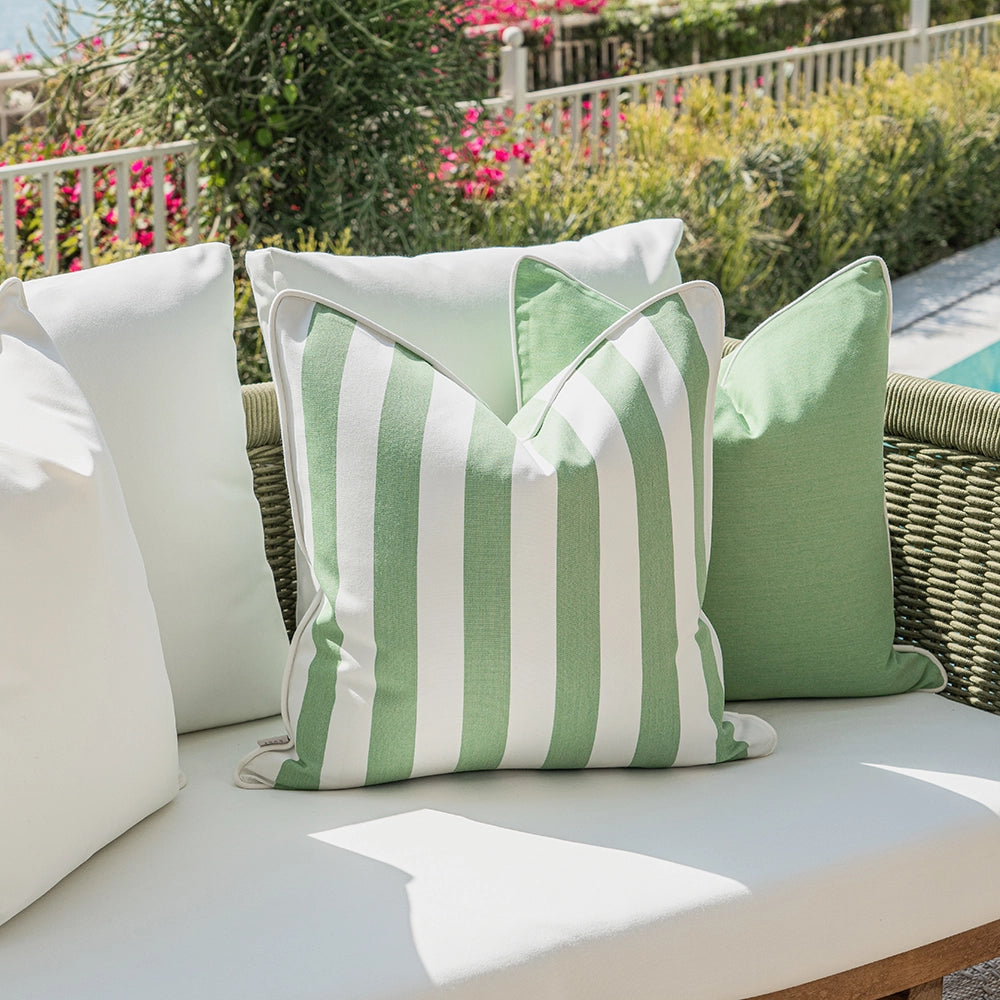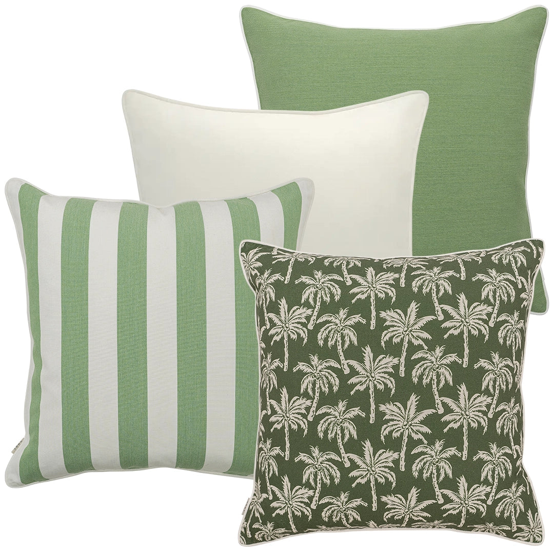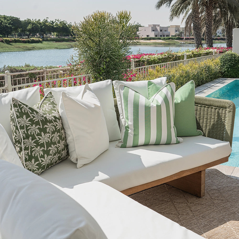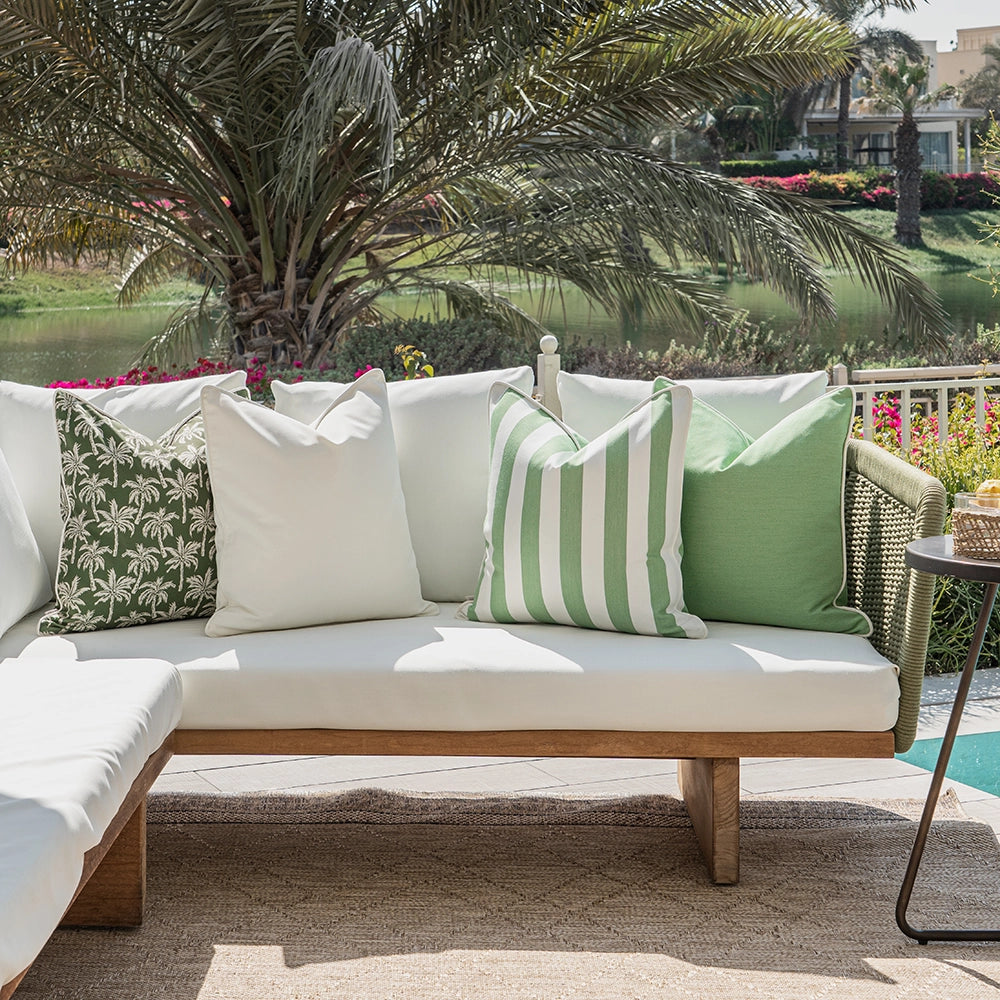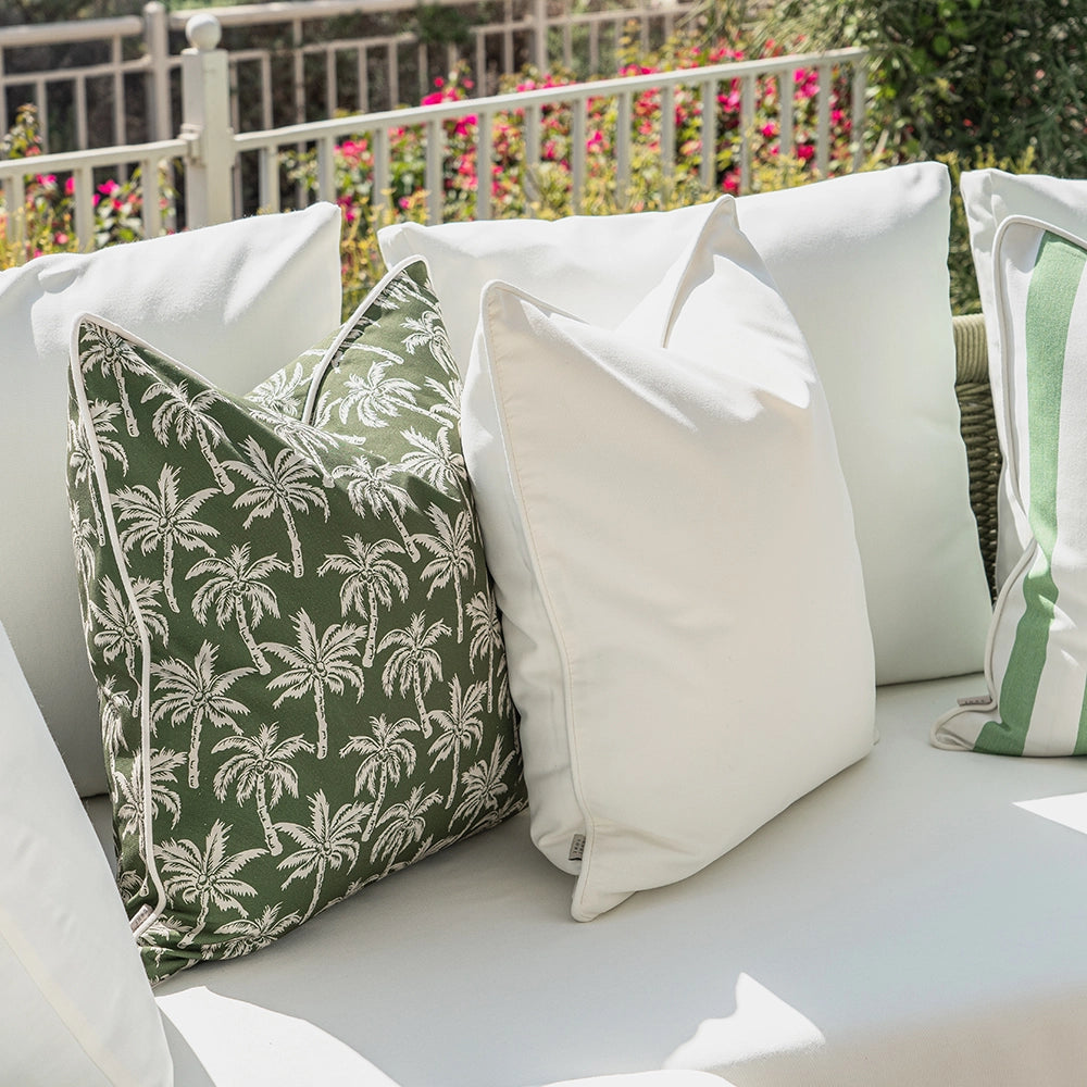 Give your patio a makeover with this ivory and green cushion set. Mixing plain styles, palm tree motifs and wide vertical stripes, it's the perfect new-season refresh for your outdoor space.