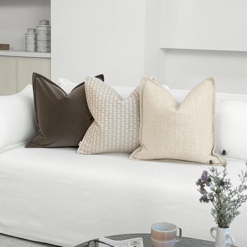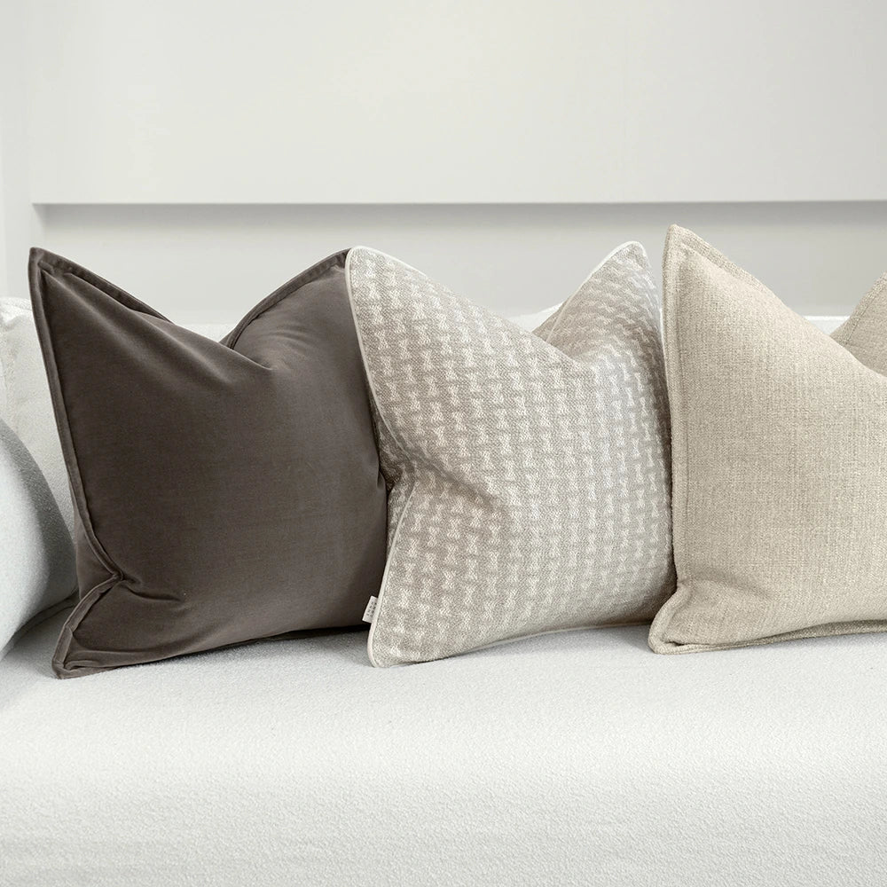 Elevate your sofa with this brown, ivory and stone colored cushion set. Featuring one plain, one bow pattern and one velvet cushion, the three-piece bundle is a luxury choice for your living space.