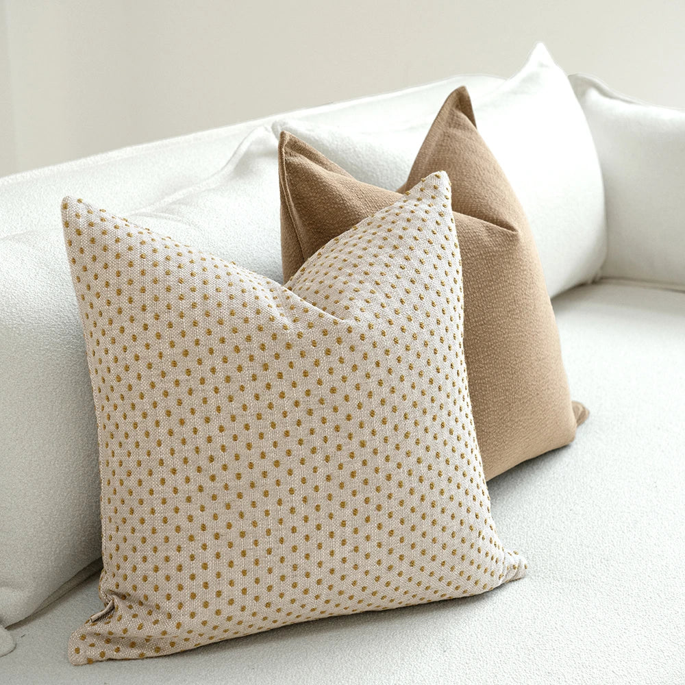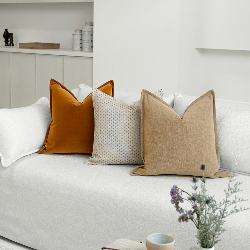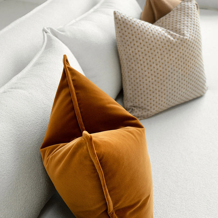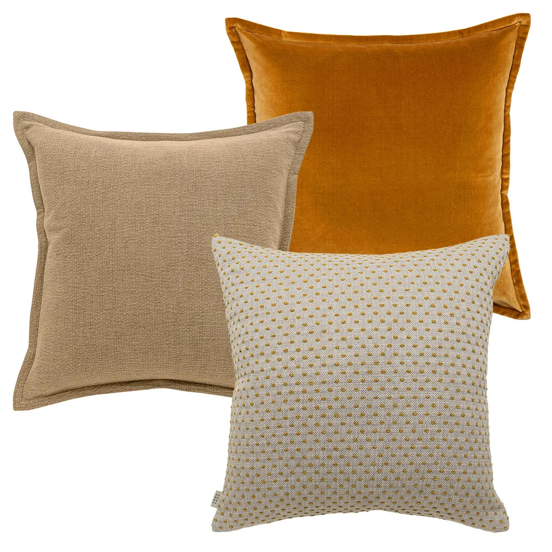 Add colour to your lounge area or bedroom with this three-piece cushion set. The designer bundle includes a muted natural brown cushion, an ochre velvet cushion and a dot pattern cushion for a playful touch.