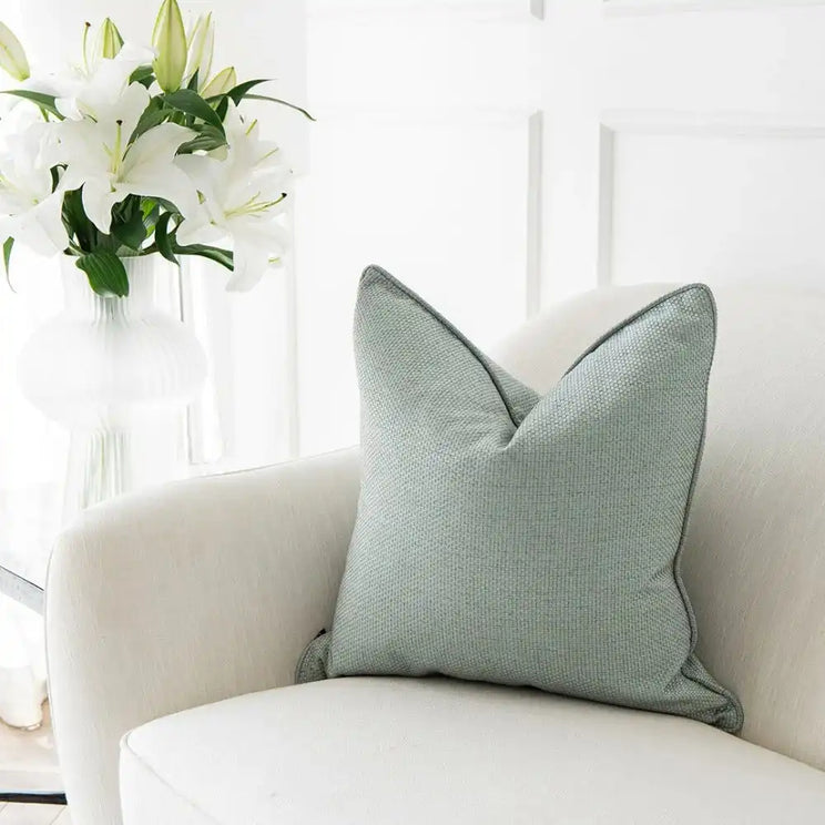 In pastel green, our Astrid Sage cushion will add a note of serenity to your living space. This pale green cushion has a textured square pattern and will complement your house plants perfectly.