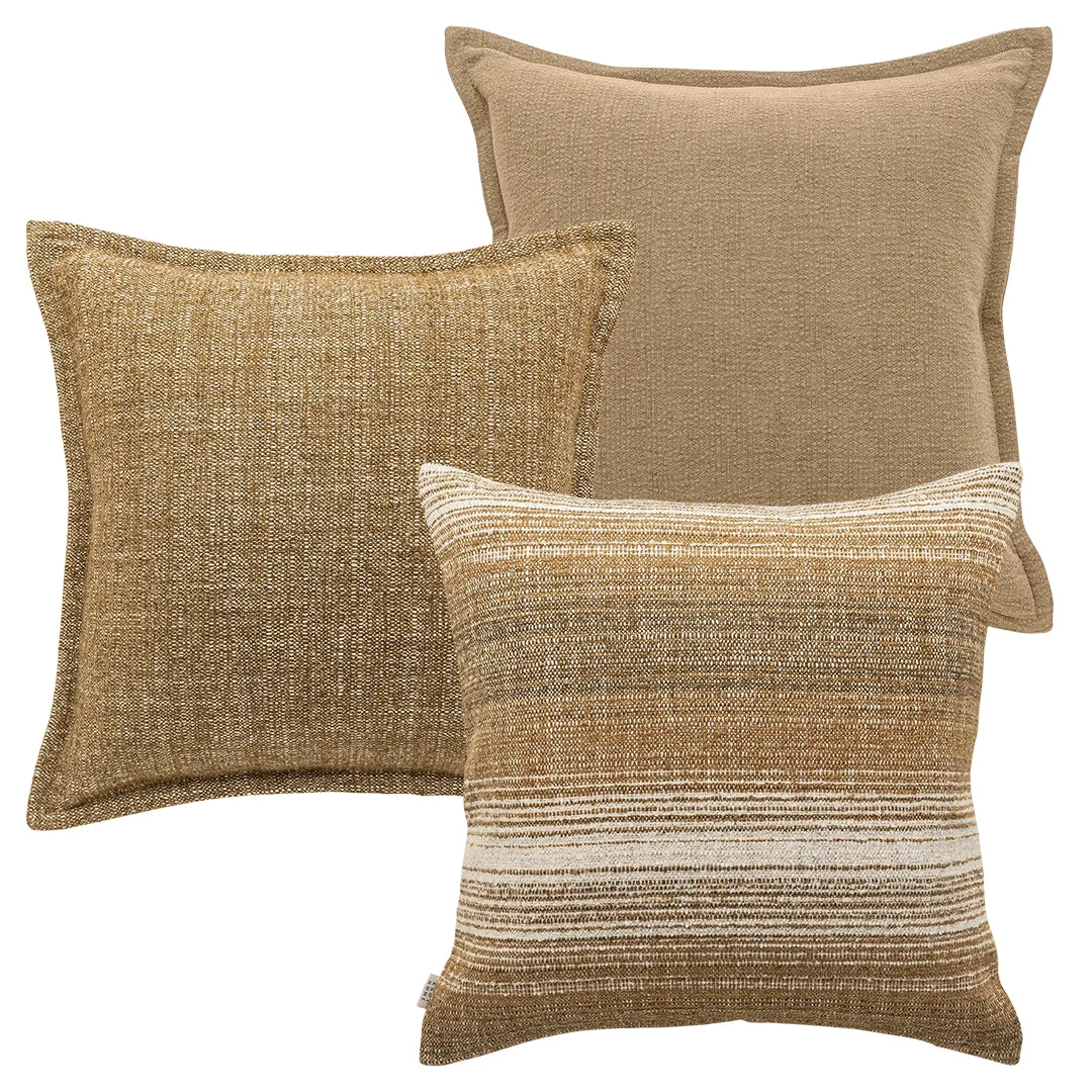 Warm up a neutral interior with this golden brown cushion bundle. The three-piece set includes plain and striped cushions in a honey-toned colour palette for a chic and inviting look.