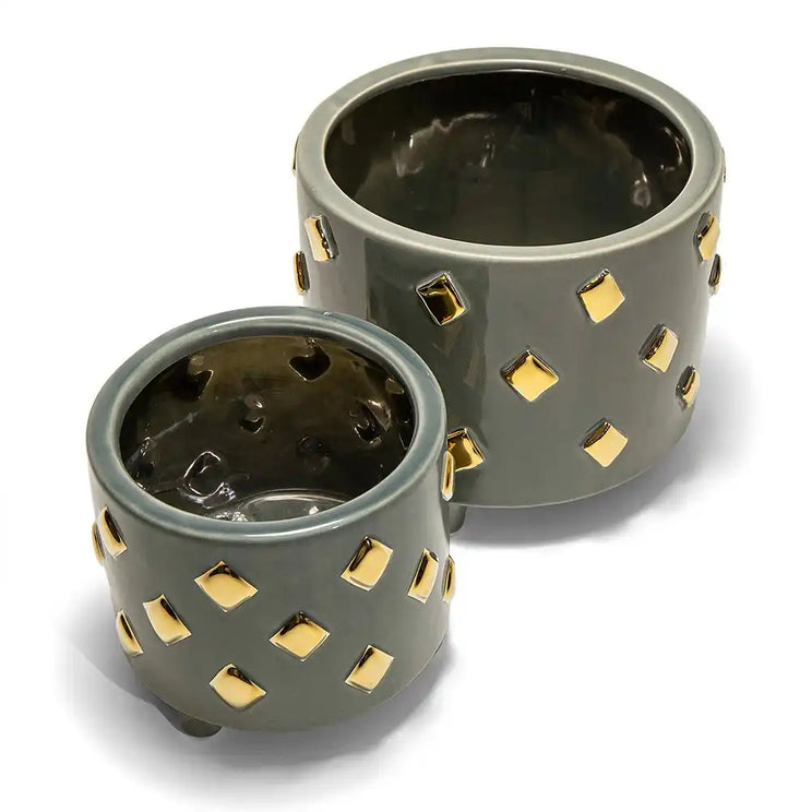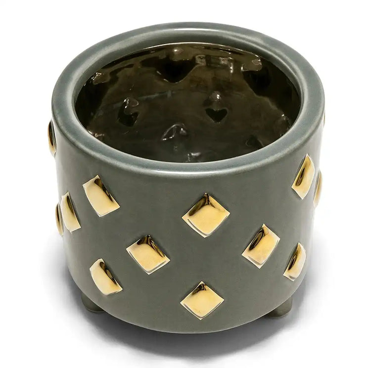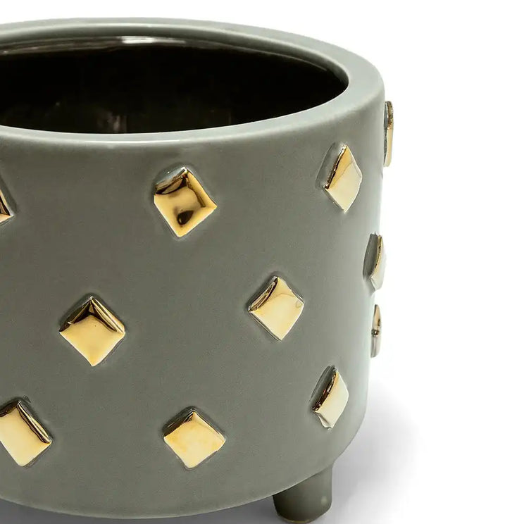 These glossy ceramic pots are set on four small feet. Studded with gold squares, the grey pots make a great storage solution, or use them as decorative outer pots for indoor plants.