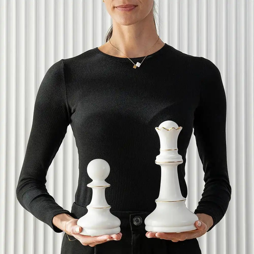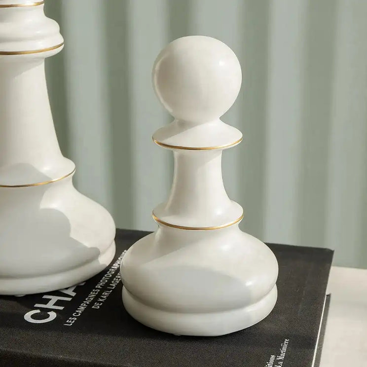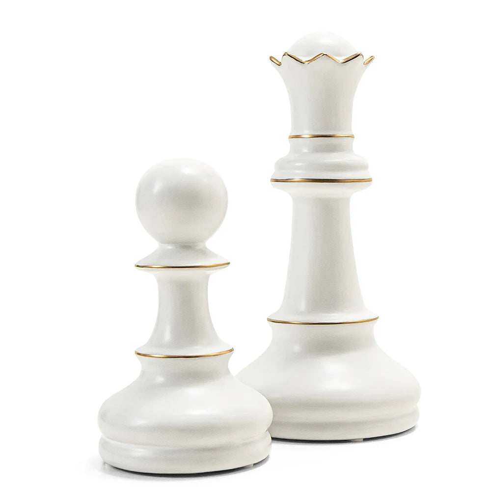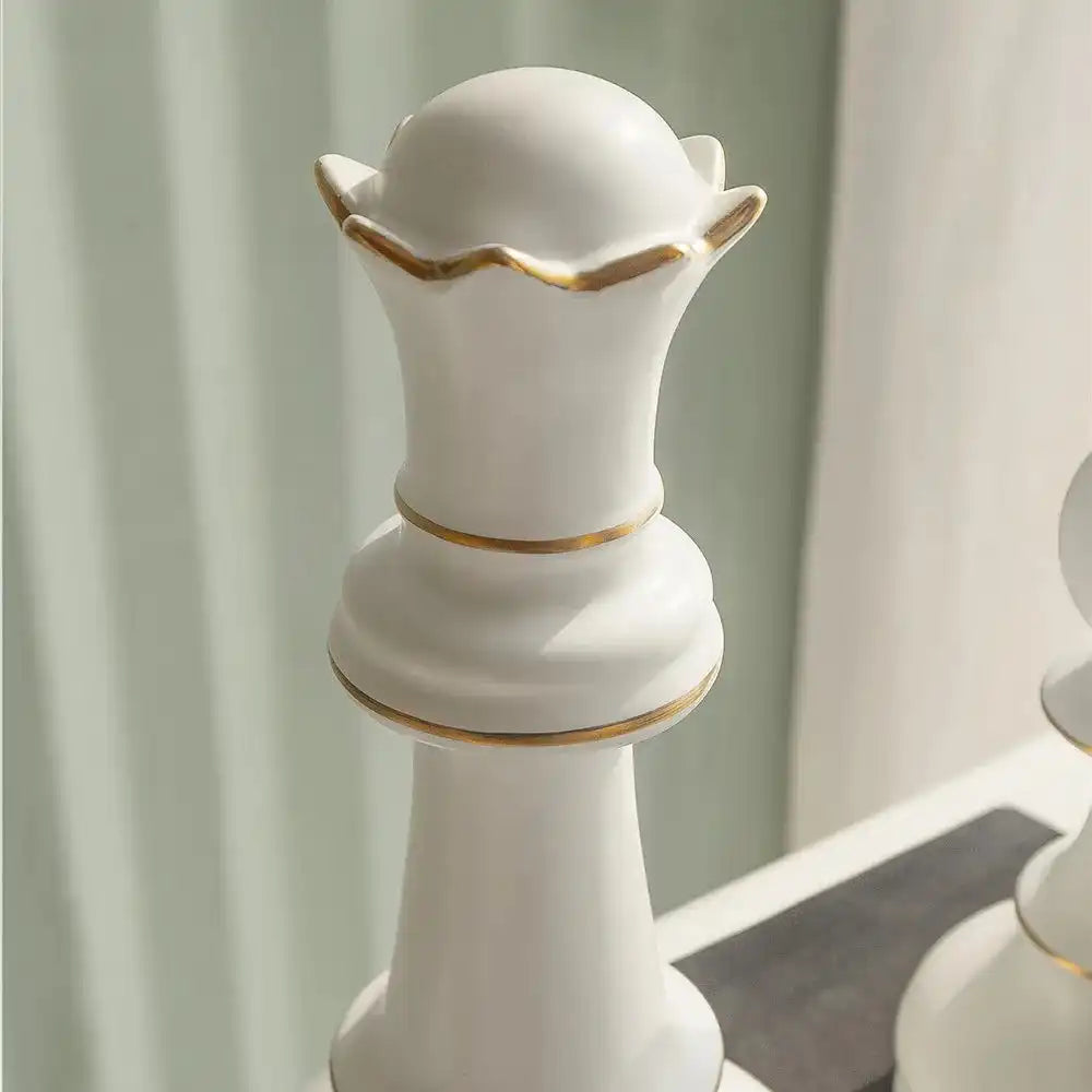 Checkmate: these porcelain chess figures add just the right amount of shine to a modern, minimalist interior. In white with gold accents, the oversized chess pieces will complement any colour palette.