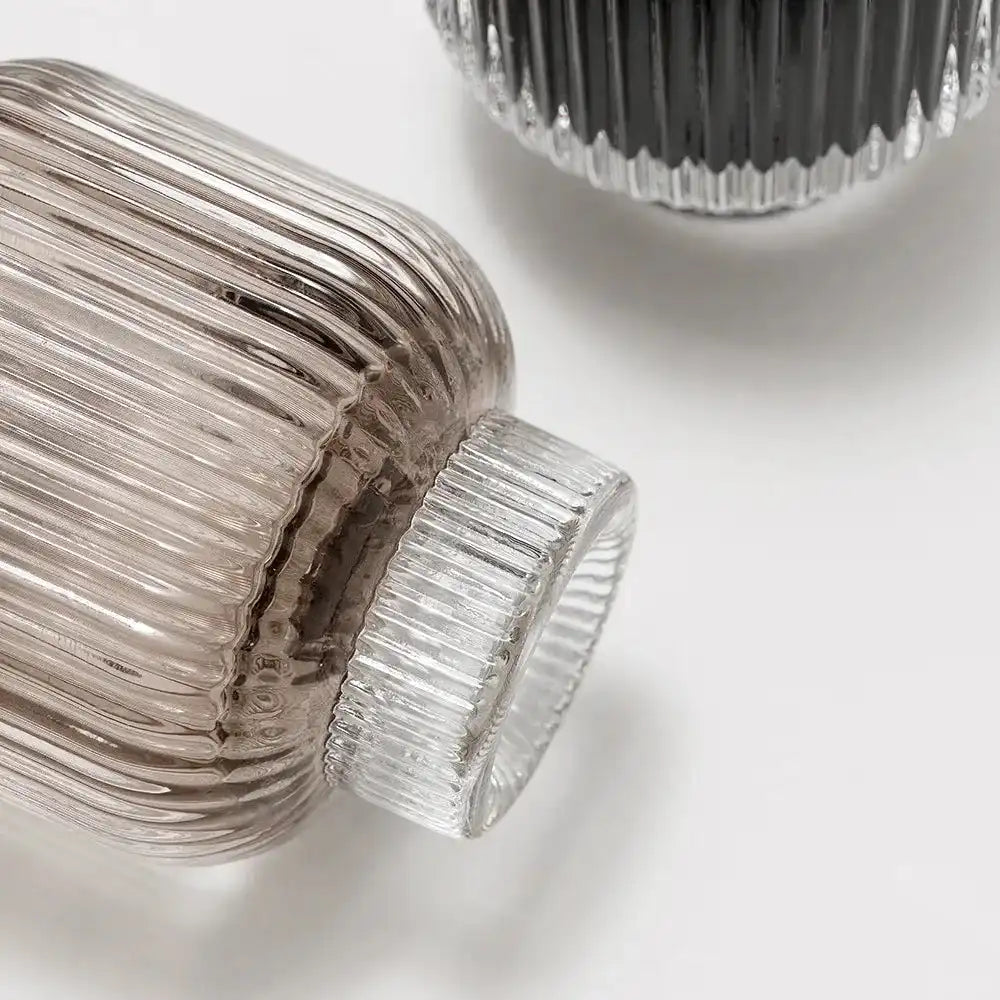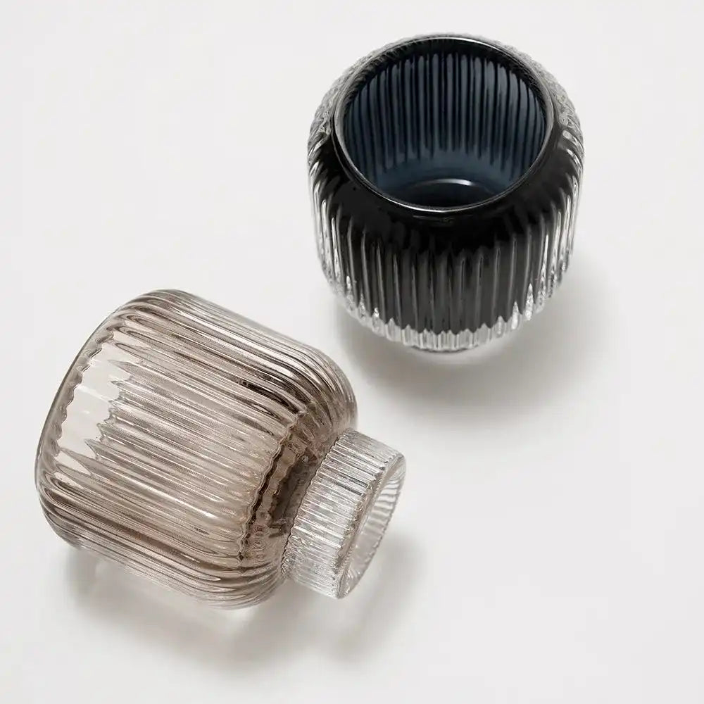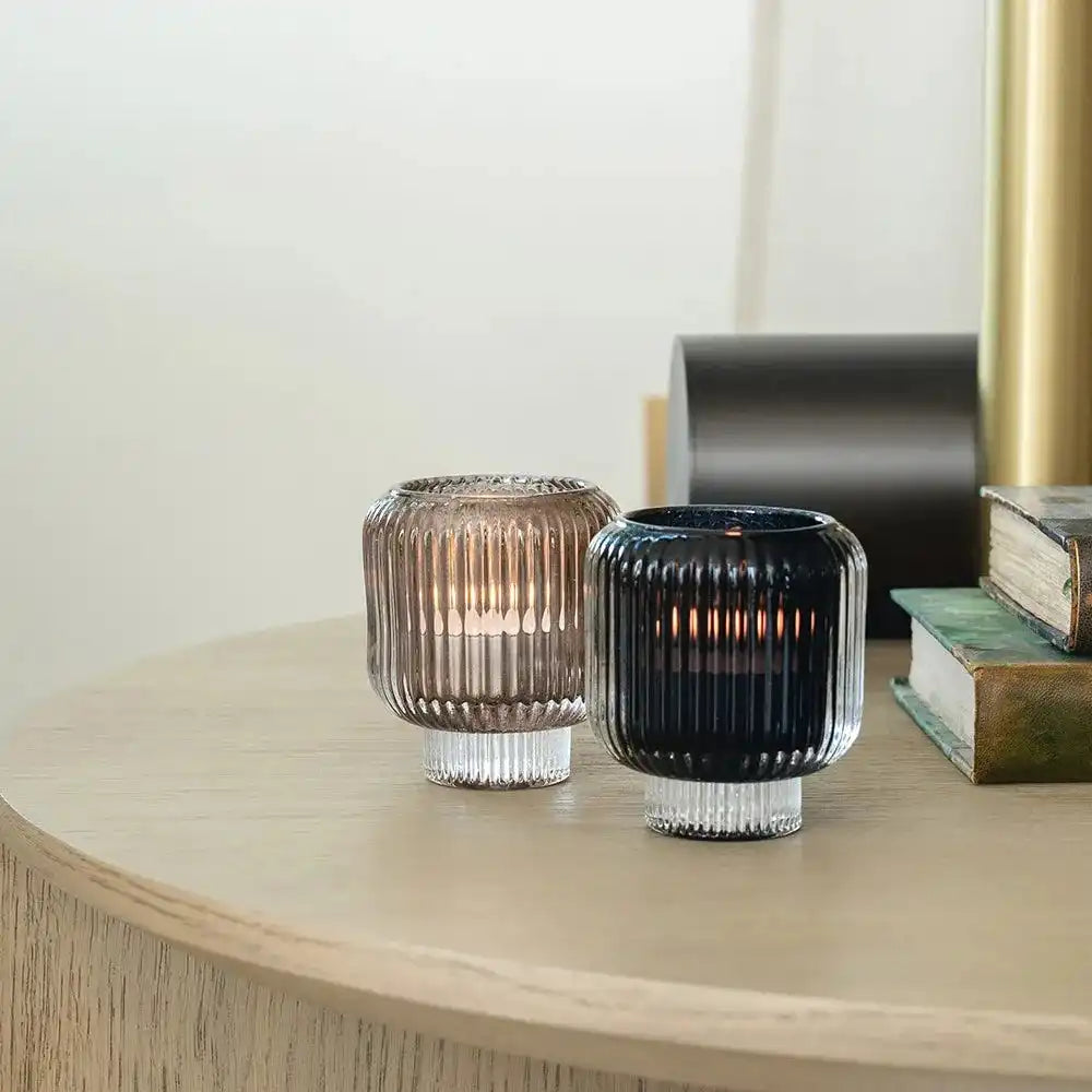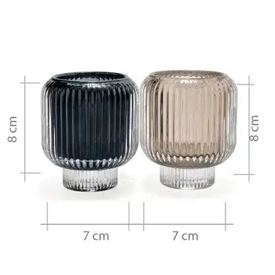 Design: Two ribbed glass candle holders with a narrow base