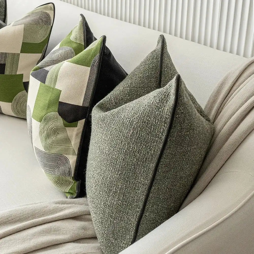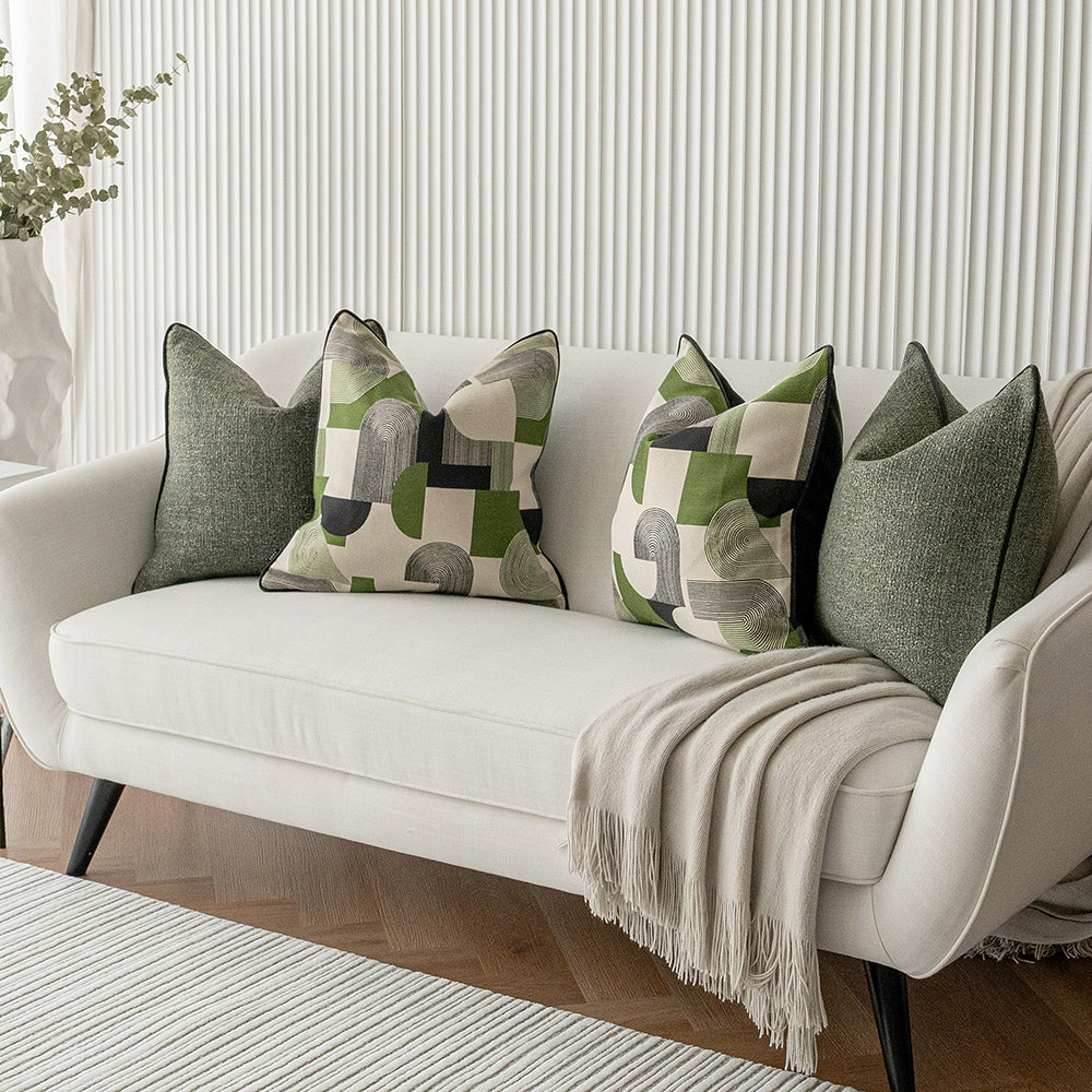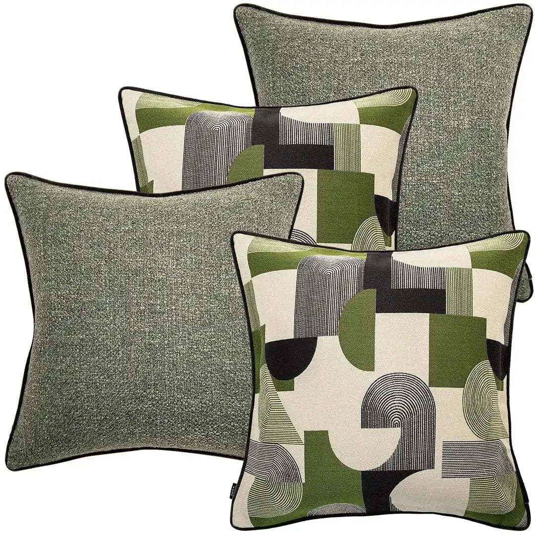 In green, beige and black, this four-piece cushion set makes a strong statement. The two geometric cushions have velvet backs for contrast, and all four are piped in black to define the silhouette.
