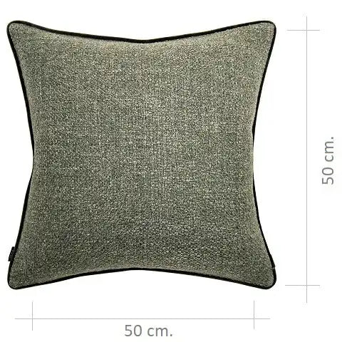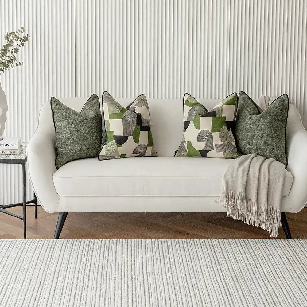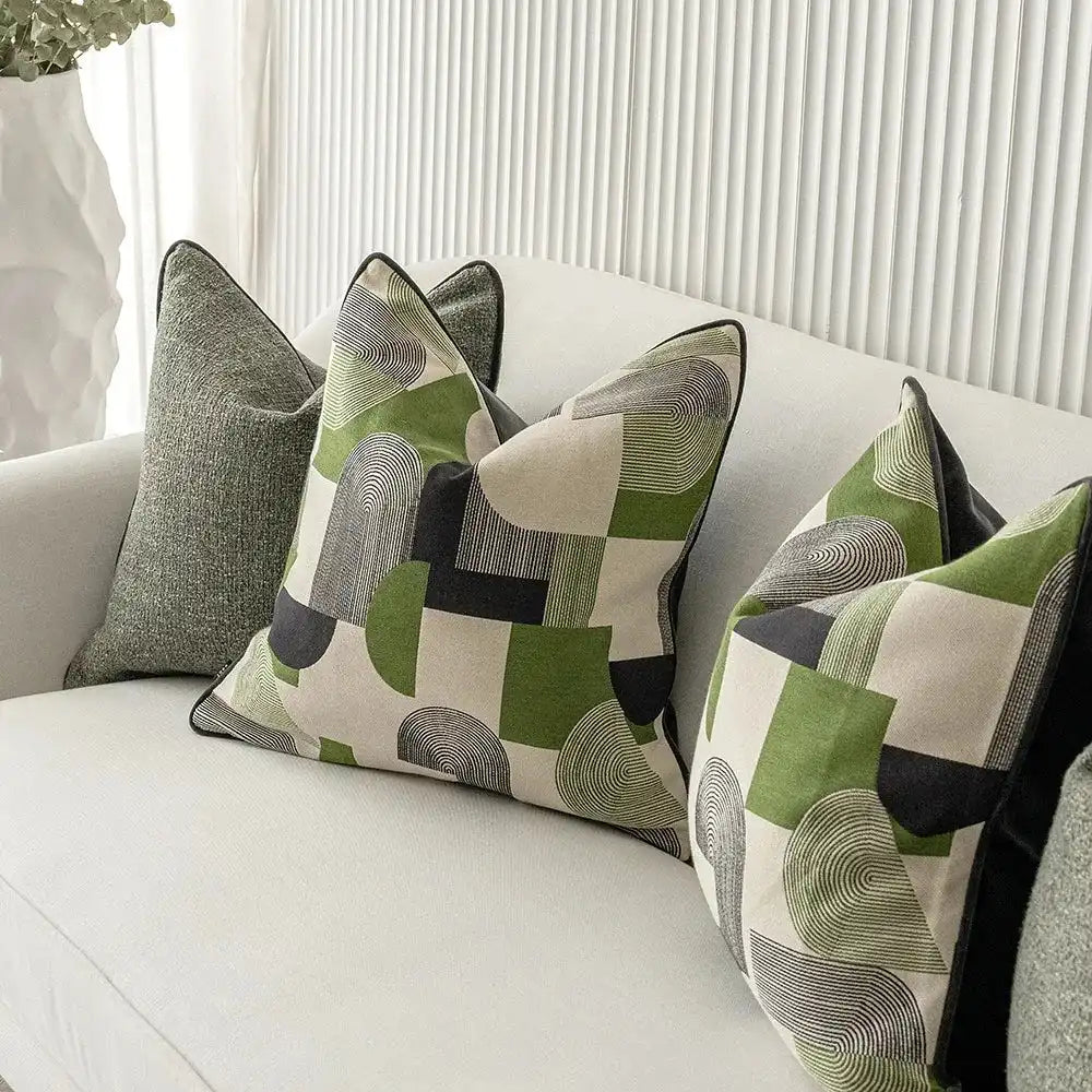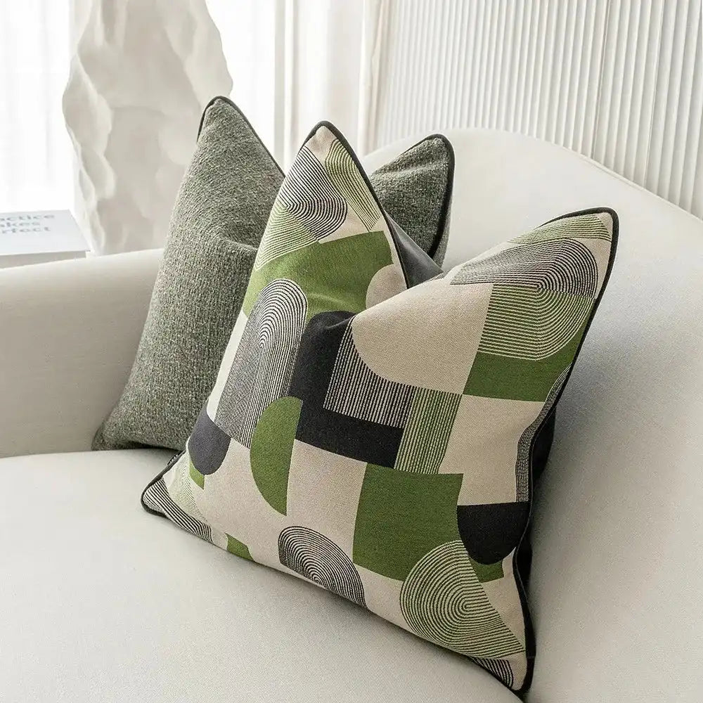 In green, beige and black, this four-piece cushion set makes a strong statement. The two geometric cushions have velvet backs for contrast, and all four are piped in black to define the silhouette.