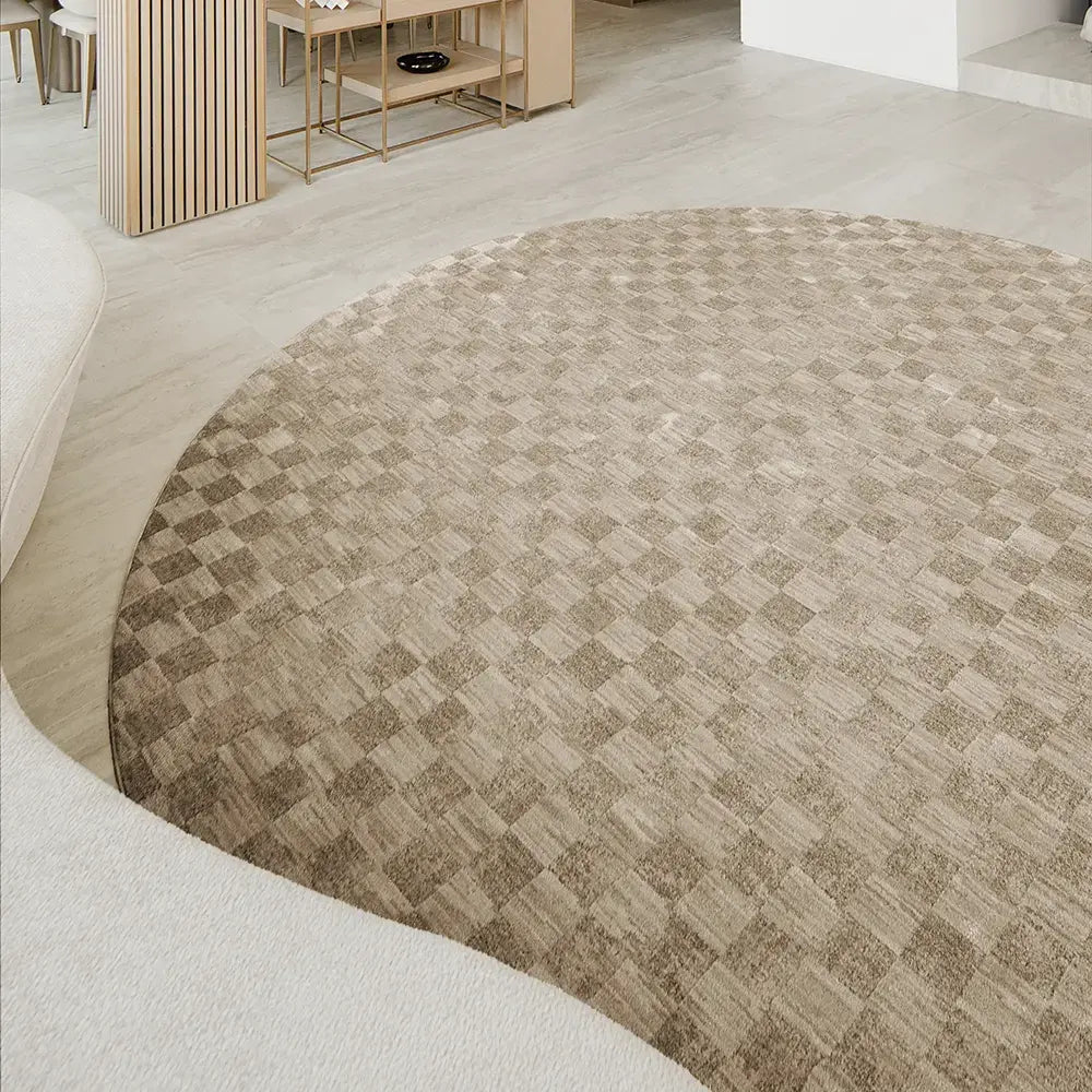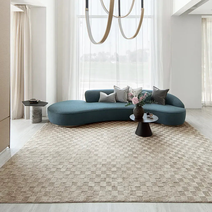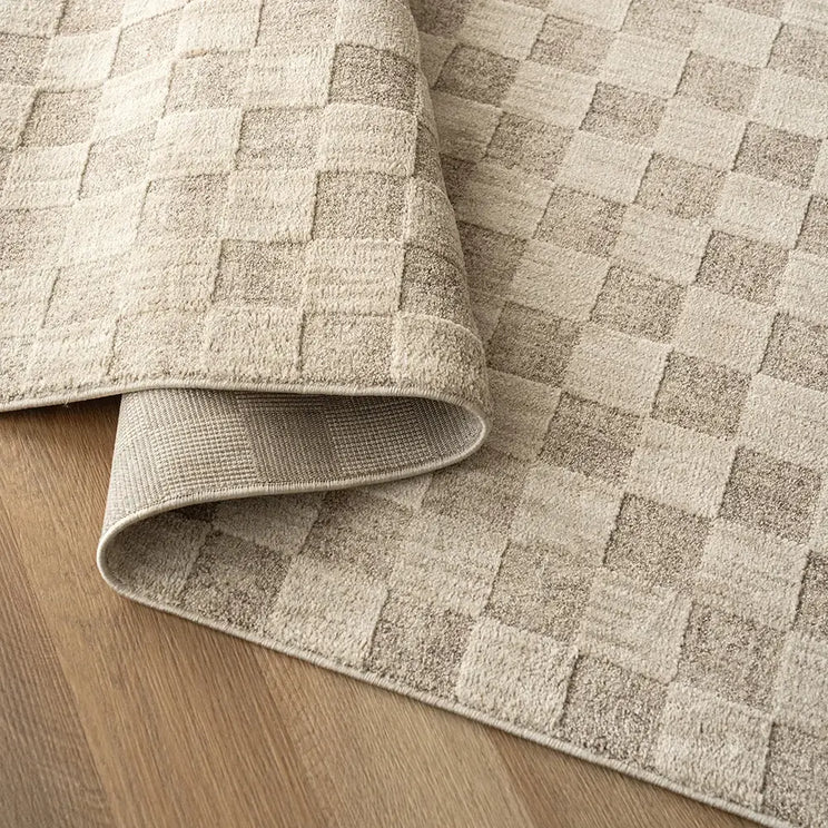 Checkmate: this geometric carpet will lend contemporary flair to your interior. In beige and taupe, the neutral carpet features a rectangular checkerboard design for an instant style refresh.
