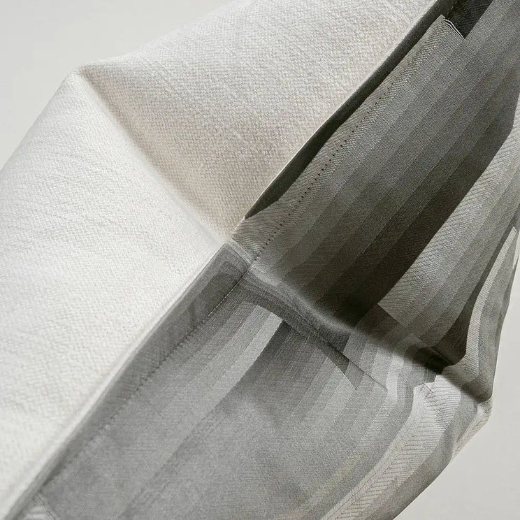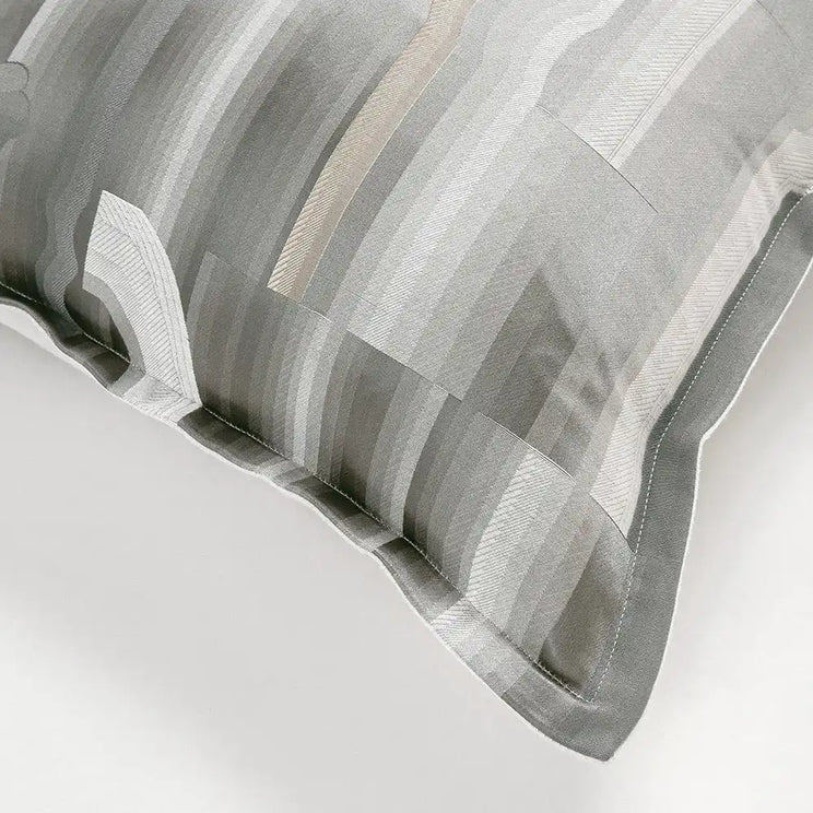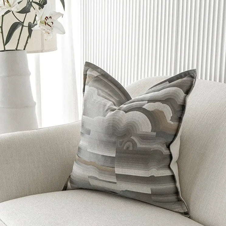 This silver cushion features a linear cloud design on the front, elevated by different styles of stitching and accents of grey and gold. It's a wonderful way to make a neutral decor scheme pop.
