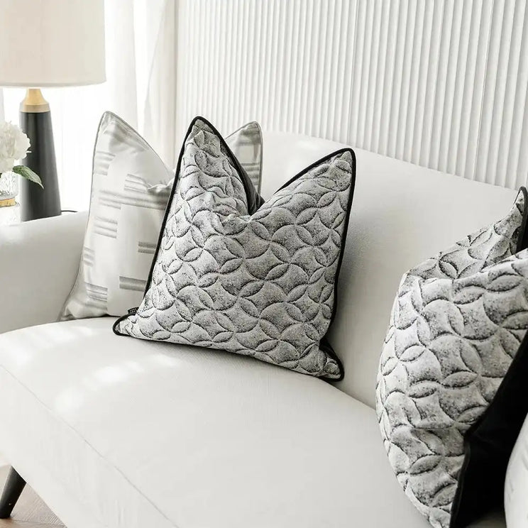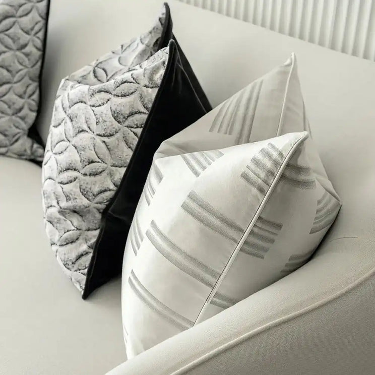 This black, white and silver cushion set will elevate a modern interior. It includes two shiny line pattern cushions and two trompe l'oeil cushions with a pixellated quilt design on the front.