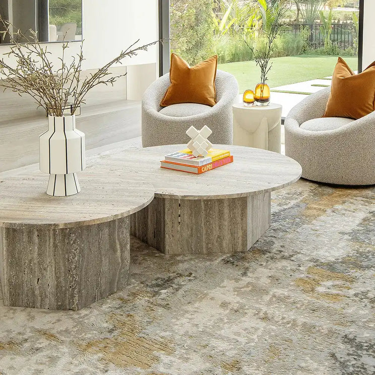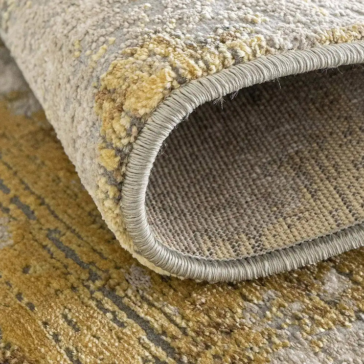 This grey and gold abstract carpet has a crackled effect to give it a unique character.