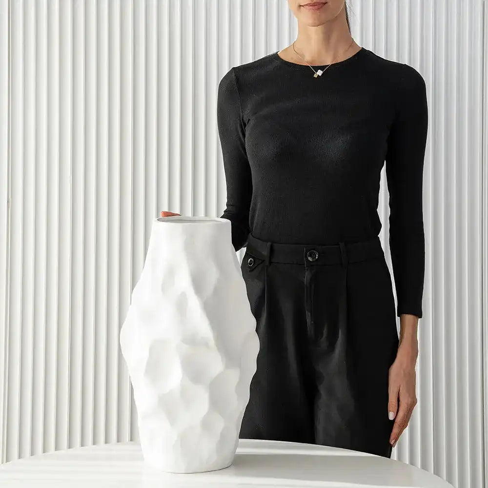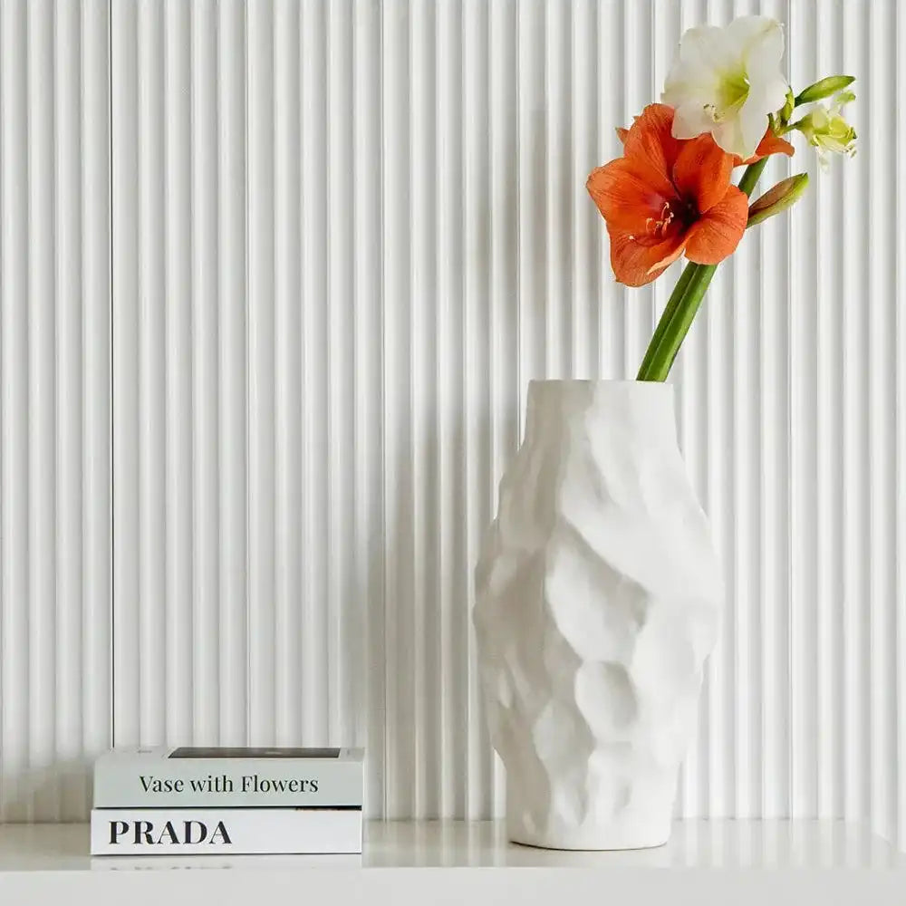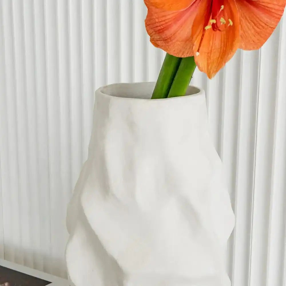 This textured vase has a slightly irregular silhouette, with indentations all over to give it a hand-crafted, organic feel. Tapering at the top and bottom, it’s the ideal shape to hold a single stem.