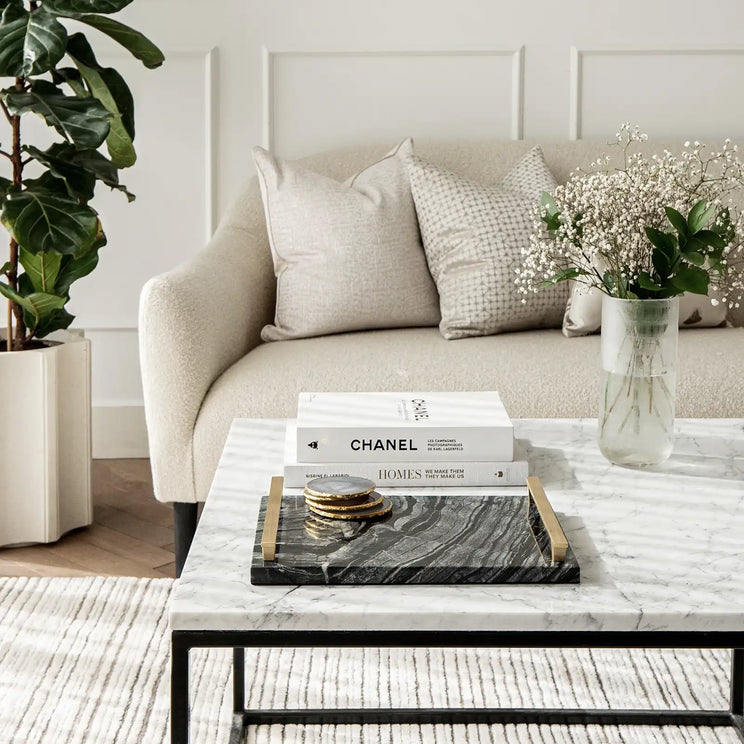 In natural marble with brushed gold handles, this decorative tray is an opulent addition to your living room. Perfect for serving drinks with style, it's also a beautiful accessory in its own right.