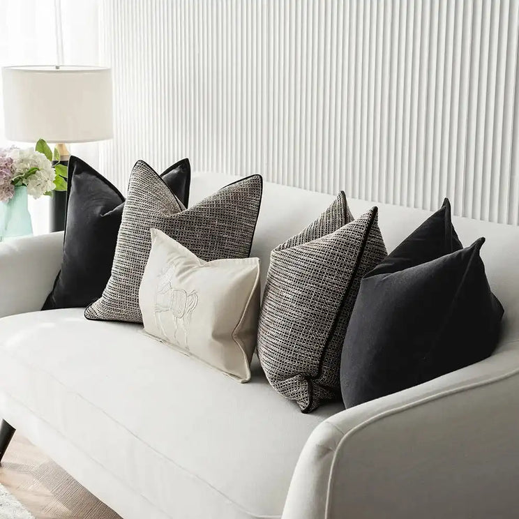 Black and white create a powerful contrast in this modern cushion bundle. We've teamed two velvet cushions with two jacquard cushions and a white faux leather accent cushion to liven up your sofa.