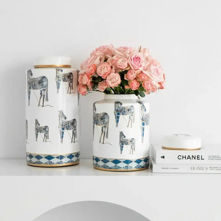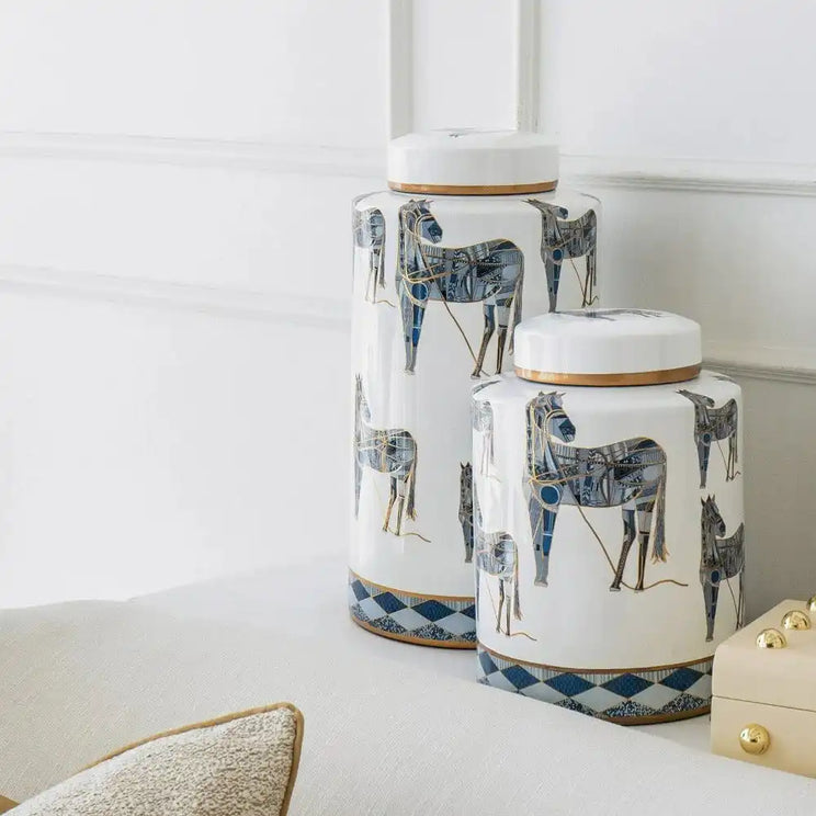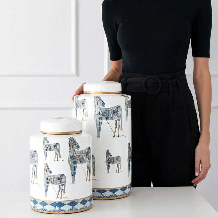 Keep clutter at bay and add a designer flourish to your home with this popular and versatile canister set. It includes two white ceramic jars with a playful horse design in blue with gold accents.