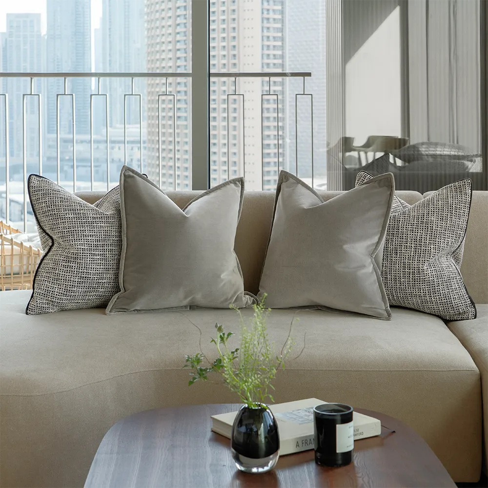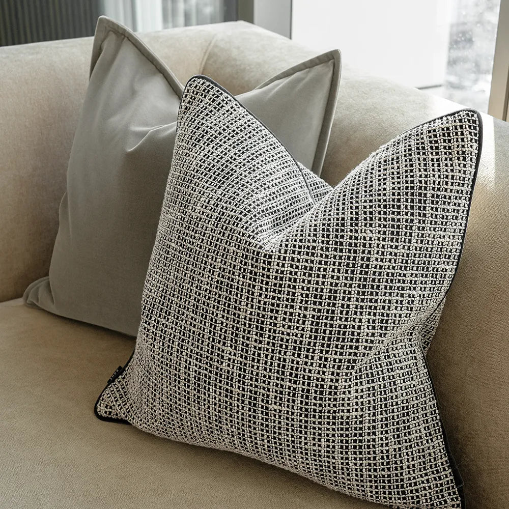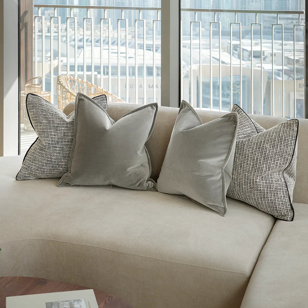 Design: Two grid-pattern jacquard cushions and two velvet cushions