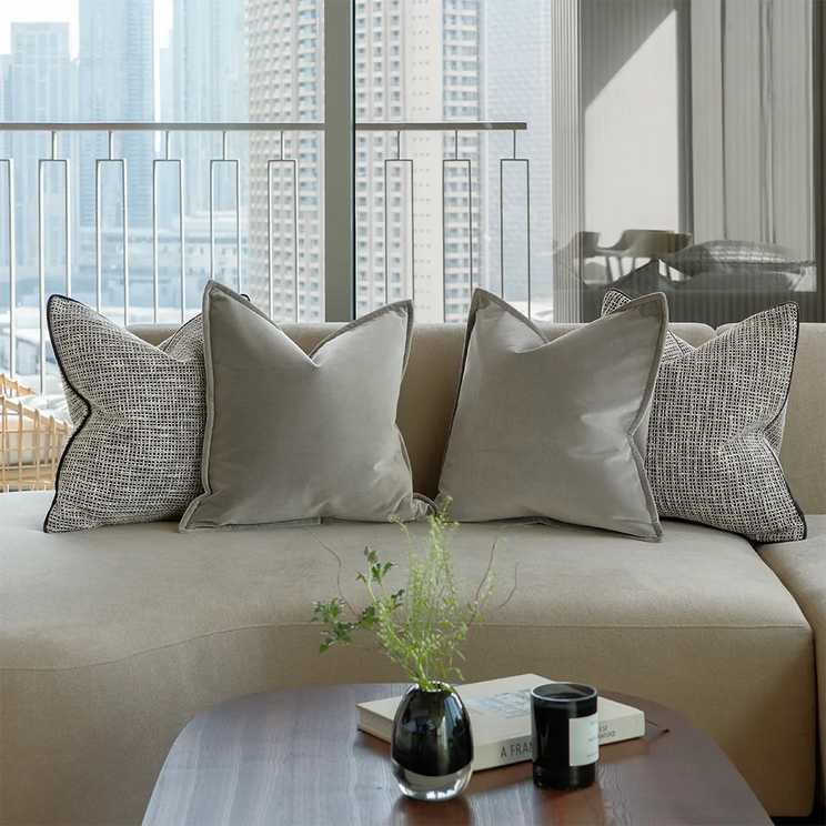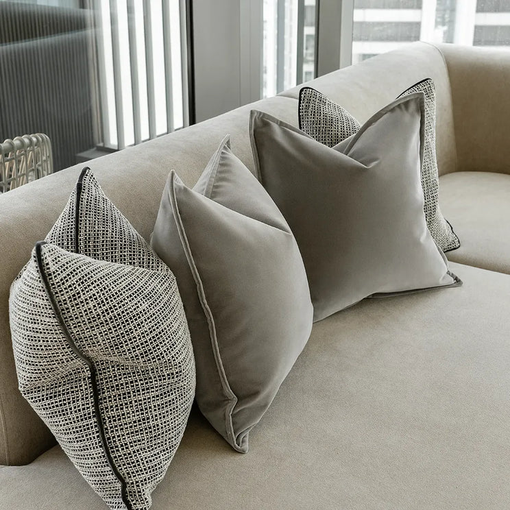 In black, white and grey, this cushion bundle is perfect for modern homes. The four-piece set includes two grey velvet cushions and two jacquard cushions with contrast piping for a clean-lined look.