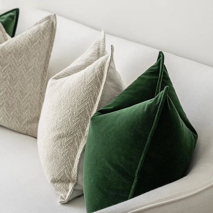 In pure cotton, this four-piece cushion set combines cosy comfort with vivid colour. We've teamed two velvet cushions in rich, dark green with two neutral zigzag cushions to create this premium bundle.
