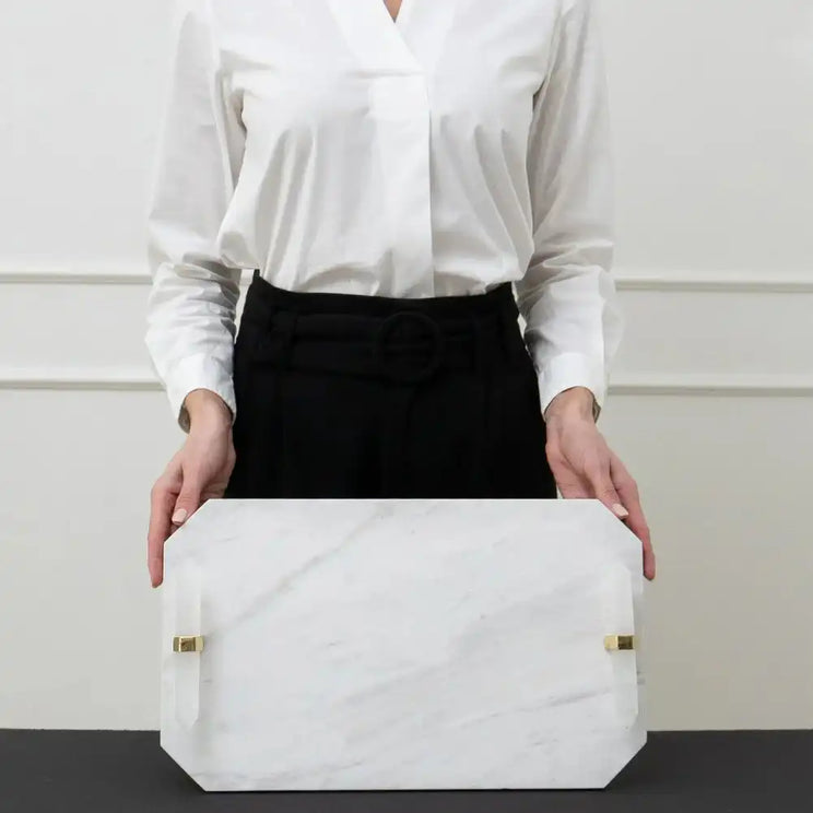 In a rectangle shape with bevelled corners, this marble tray is a chic décor accessory for your home. It features glass handles with gold-coloured accents for an opulent feel.