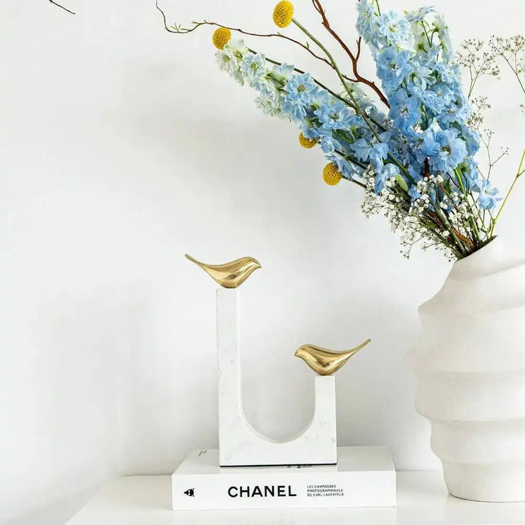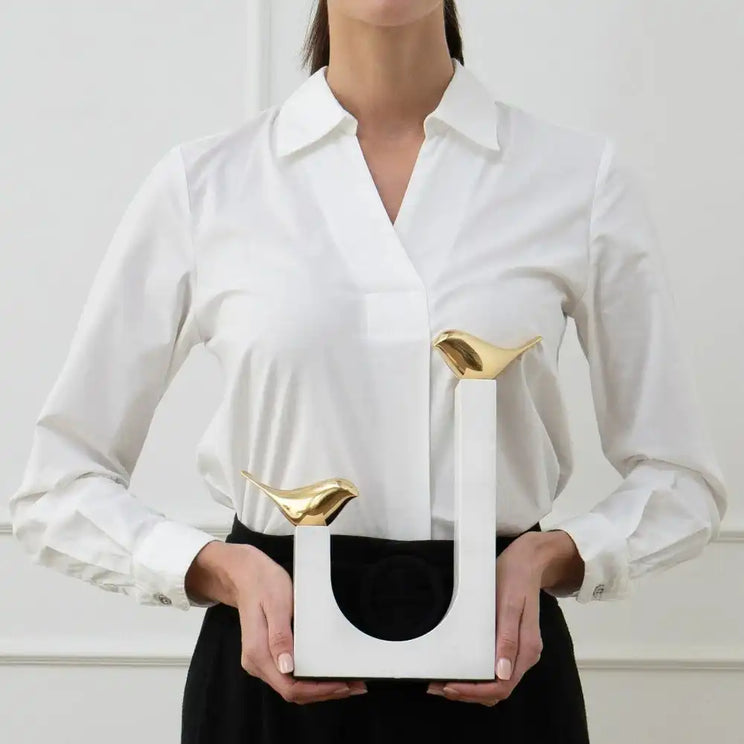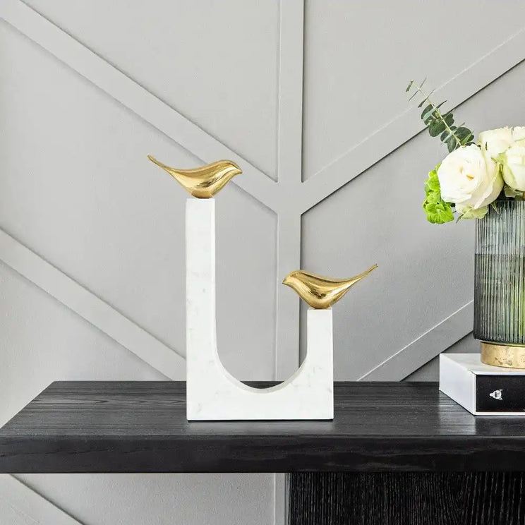 Two abstract birds face each other from the top of a U-shaped marble base in this striking sculpture. The white and gold statue is perfect for your bookshelf or console table.