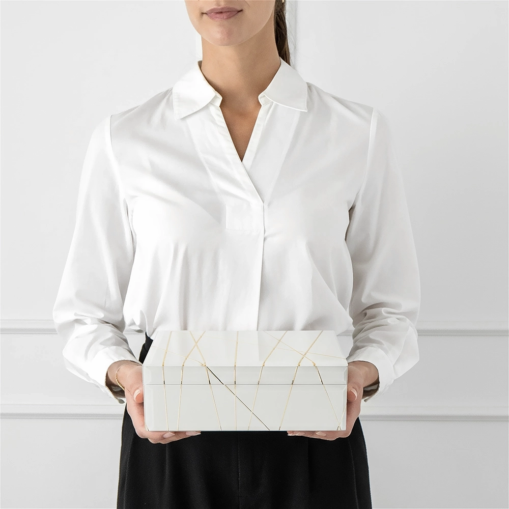 Clear surfaces create a calm aesthetic – so take care of clutter with this decorative box. With gold lines criss-crossing on a white base, it's a stylish storage solution for your interior.