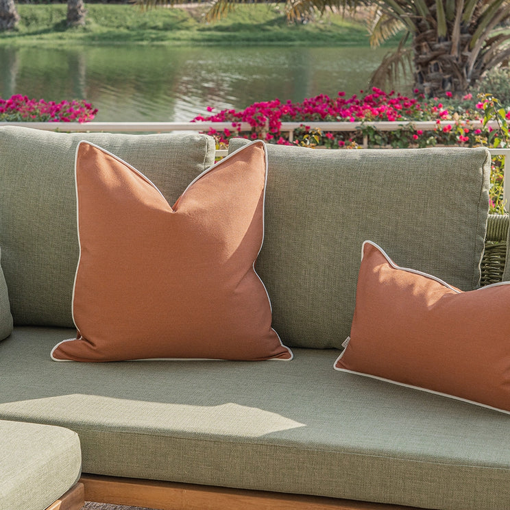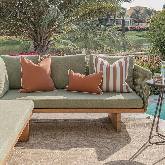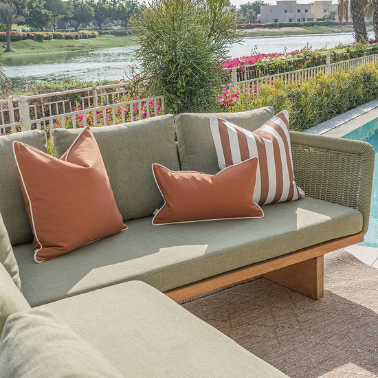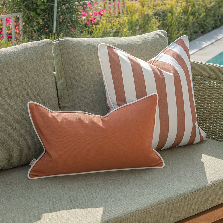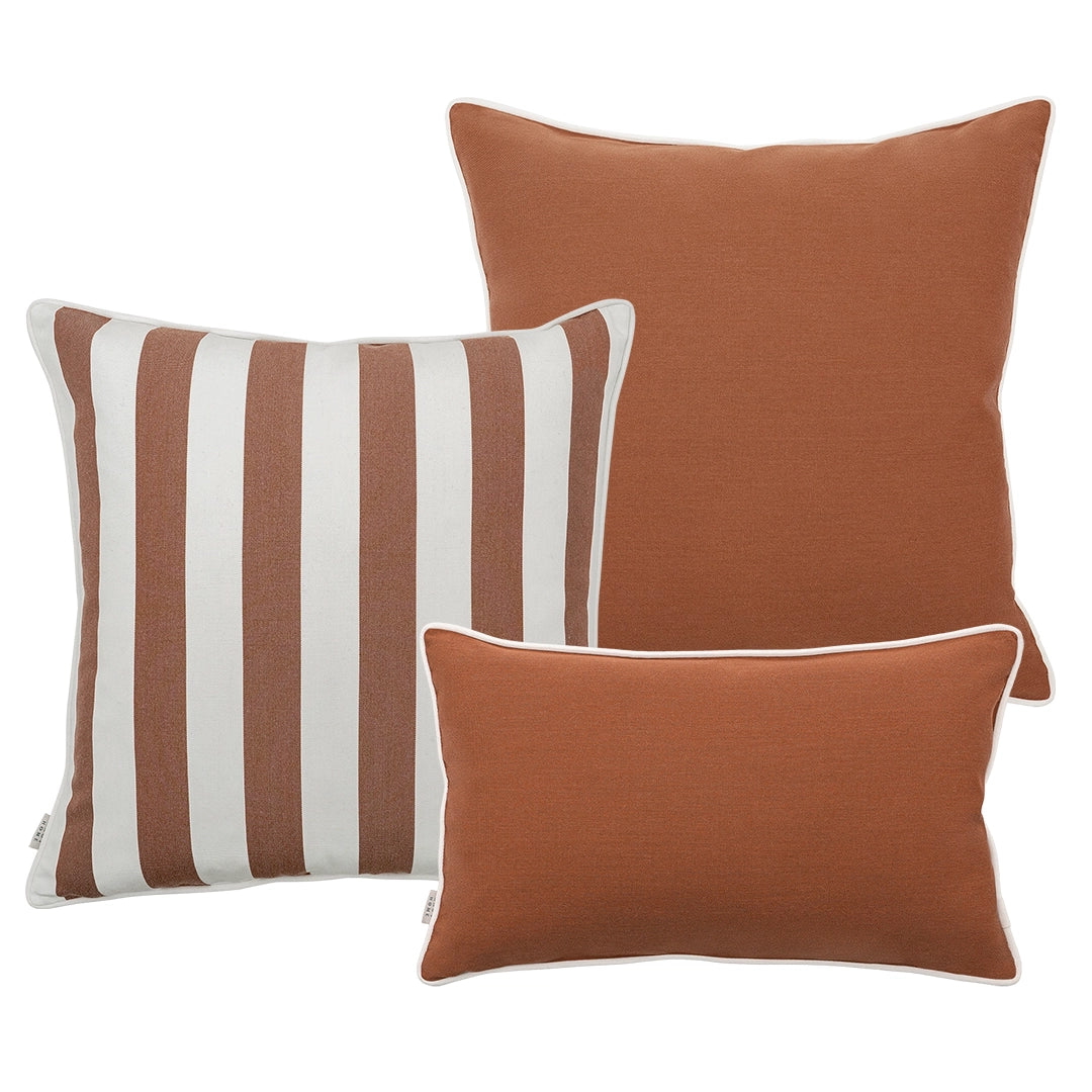 Take your style outdoors with this cushion trio. The bundle includes one plain rust cushion, one with bold vertical stripes, and a smaller accent cushion to finish. It's a must for modern patios.