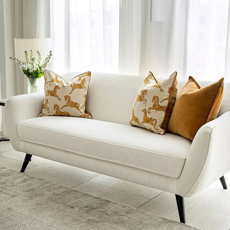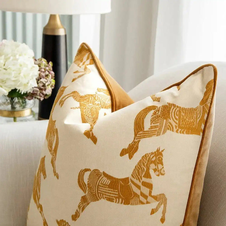 Design: Two beige cushions with dancing horse motifs, and an orange velvet accent cushion