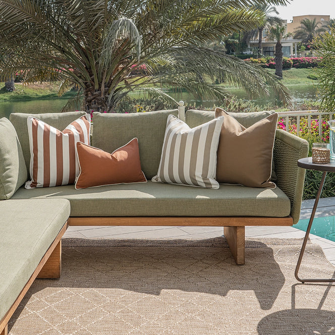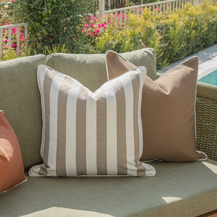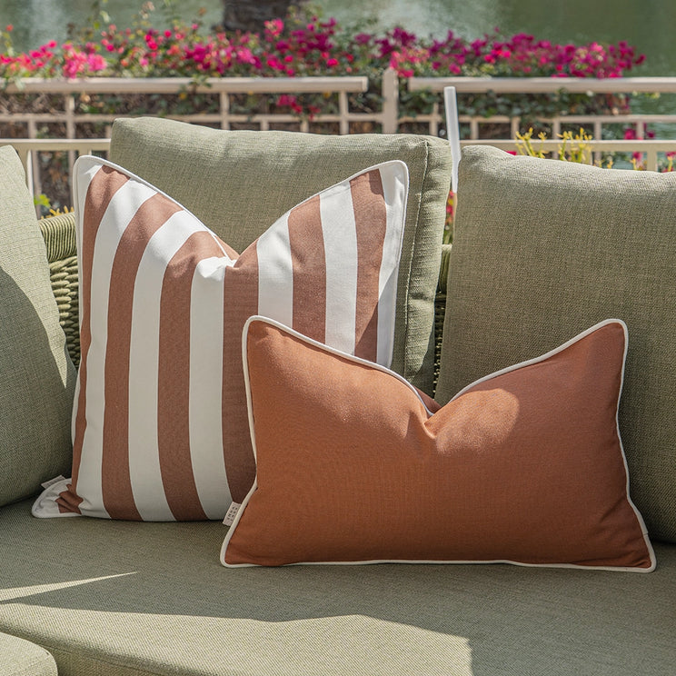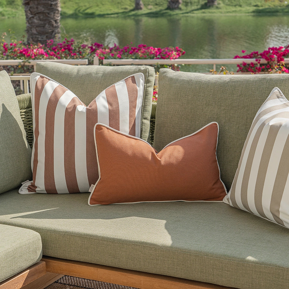 Set the scene for outdoor entertaining with this four-piece cushion set. Two wide striped cushions are teamed with a plain brown cushion, with a vivid rust accent cushion for a bold final flourish.