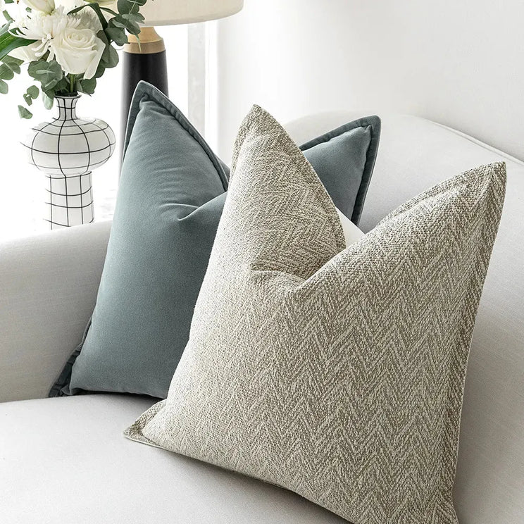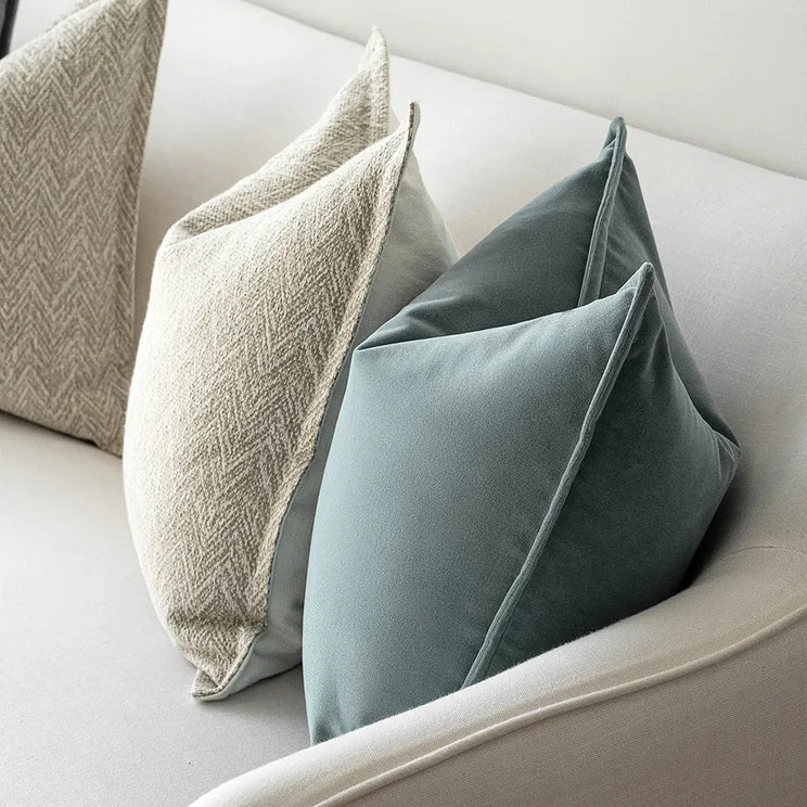 Style meets comfort in this designer cushion bundle, which includes two pale blue velvet cushions and two zigzag jacquard cushions in neutral tones. In pure cotton, it's a luxe addition to your décor.