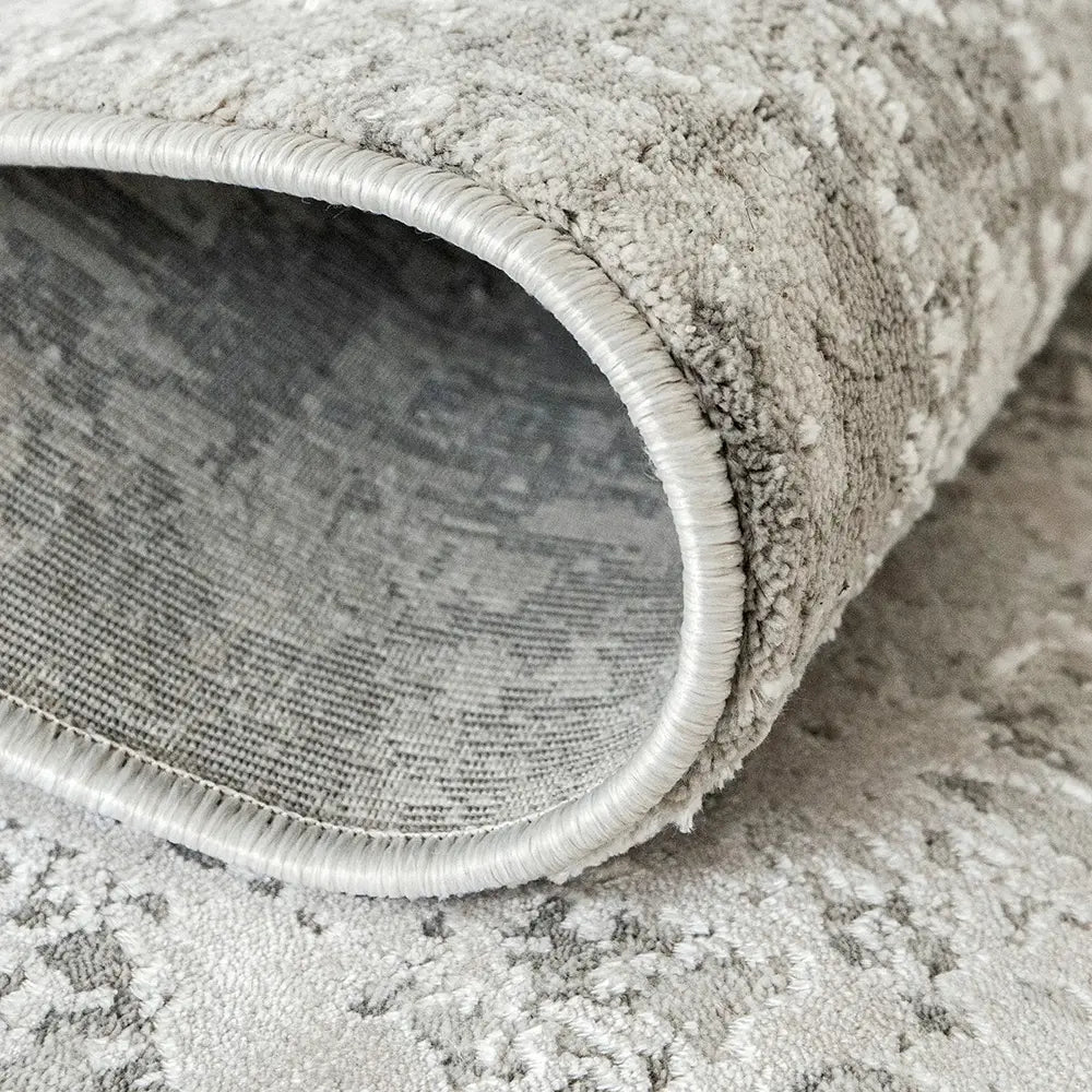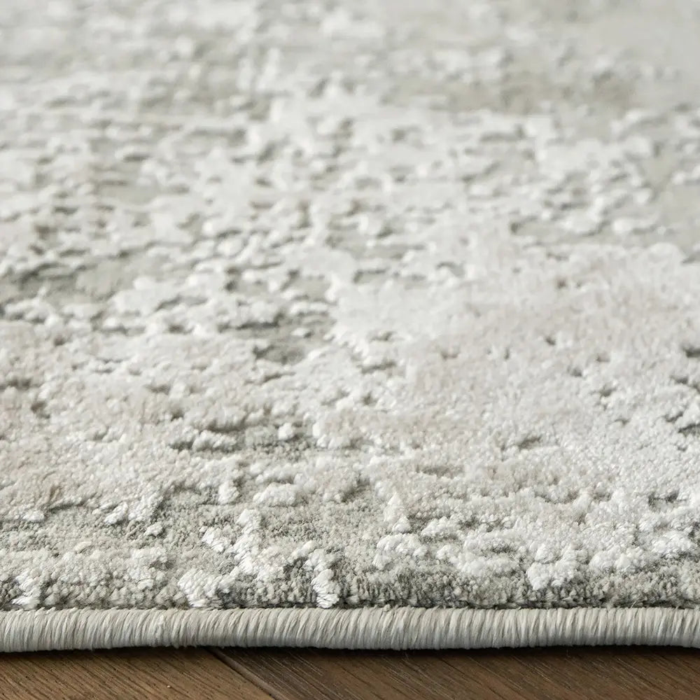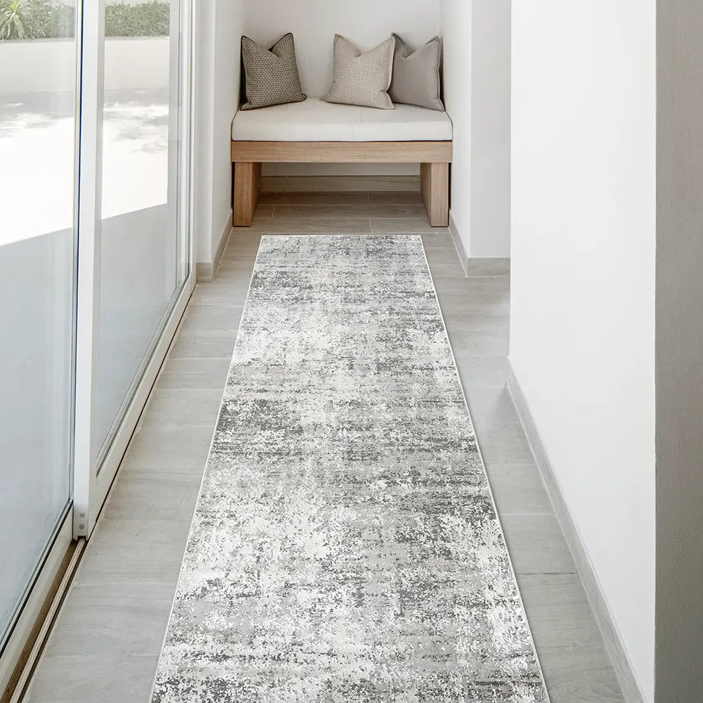 This abstract carpet in shades of grey will add warmth and texture to a contemporary home.