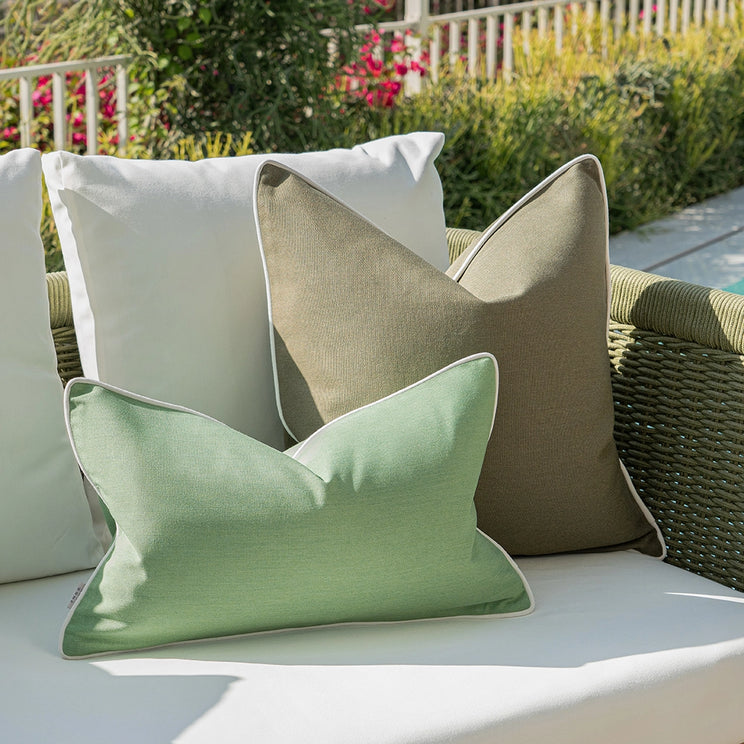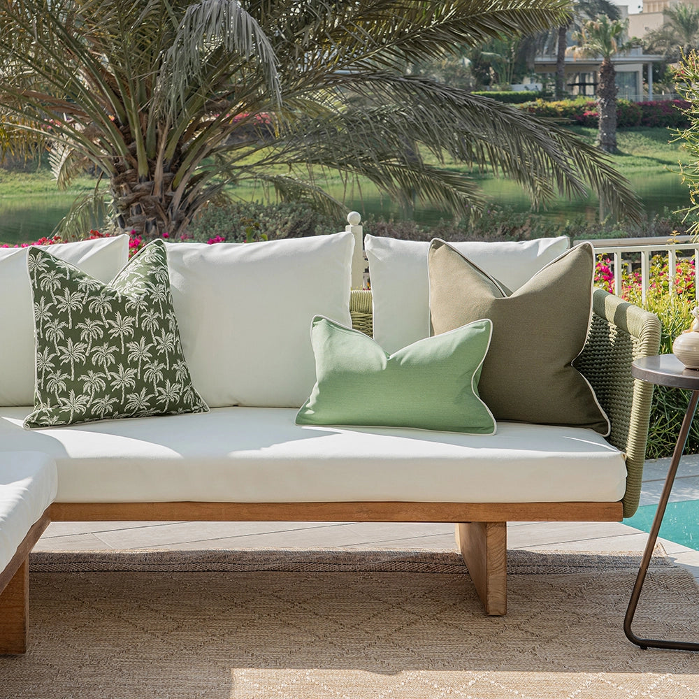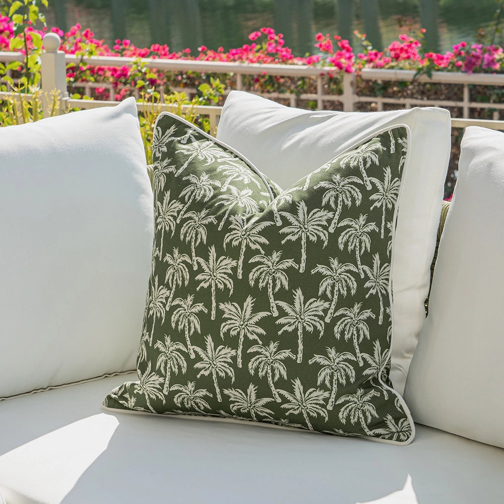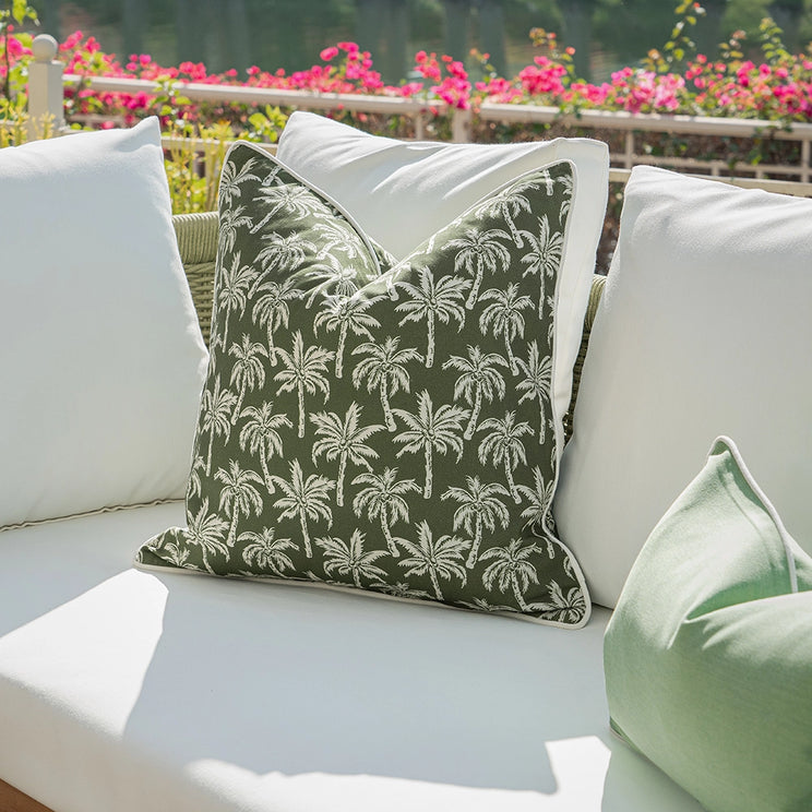 Embrace outdoor living with this green cushion bundle. We've paired a plain green cushion with an olive accent cushion, and added an elegant palm tree design for a playful, sun-drenched touch.