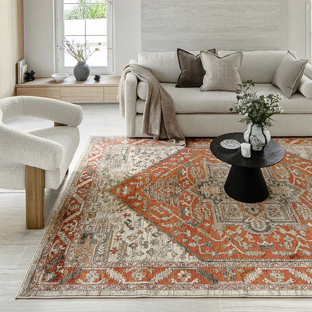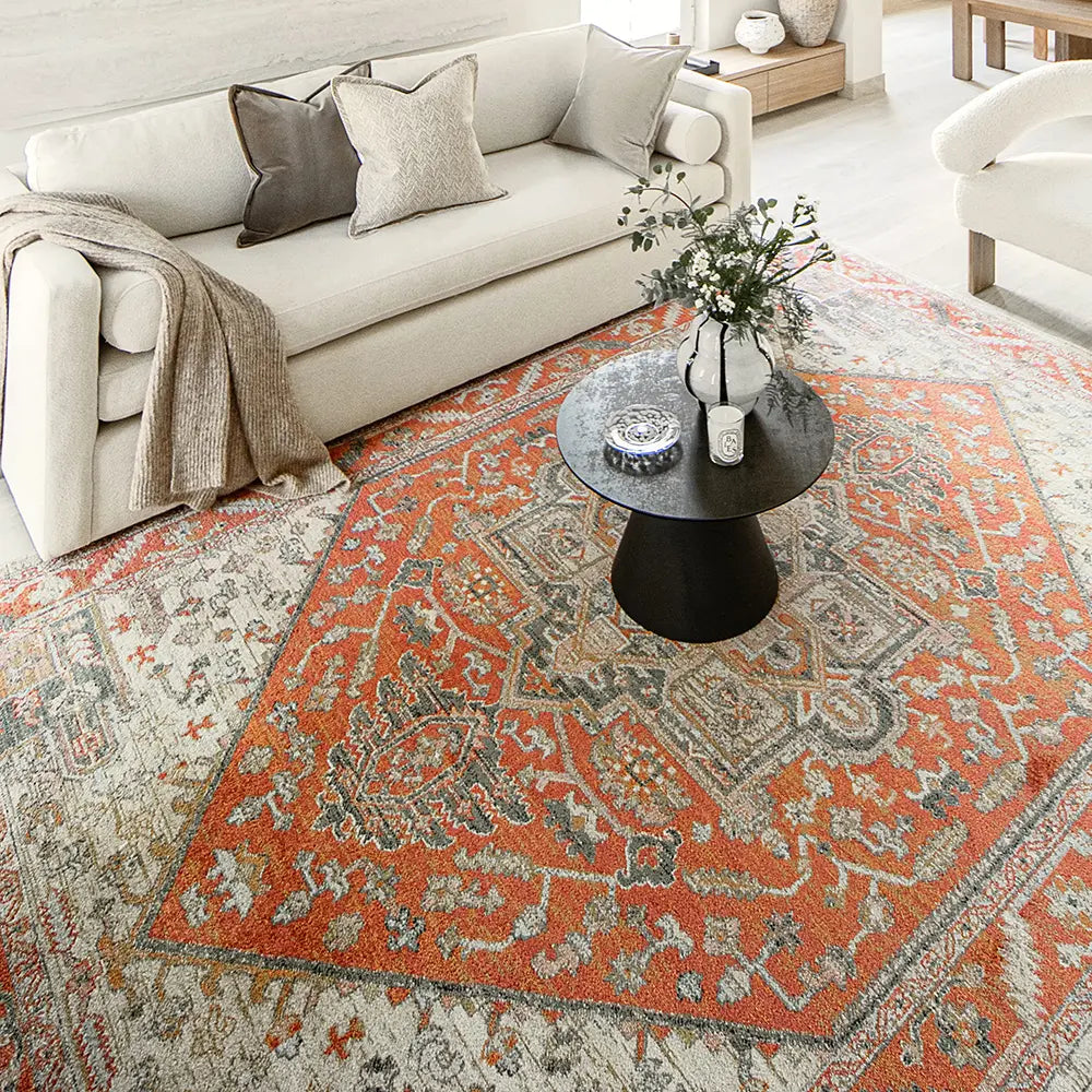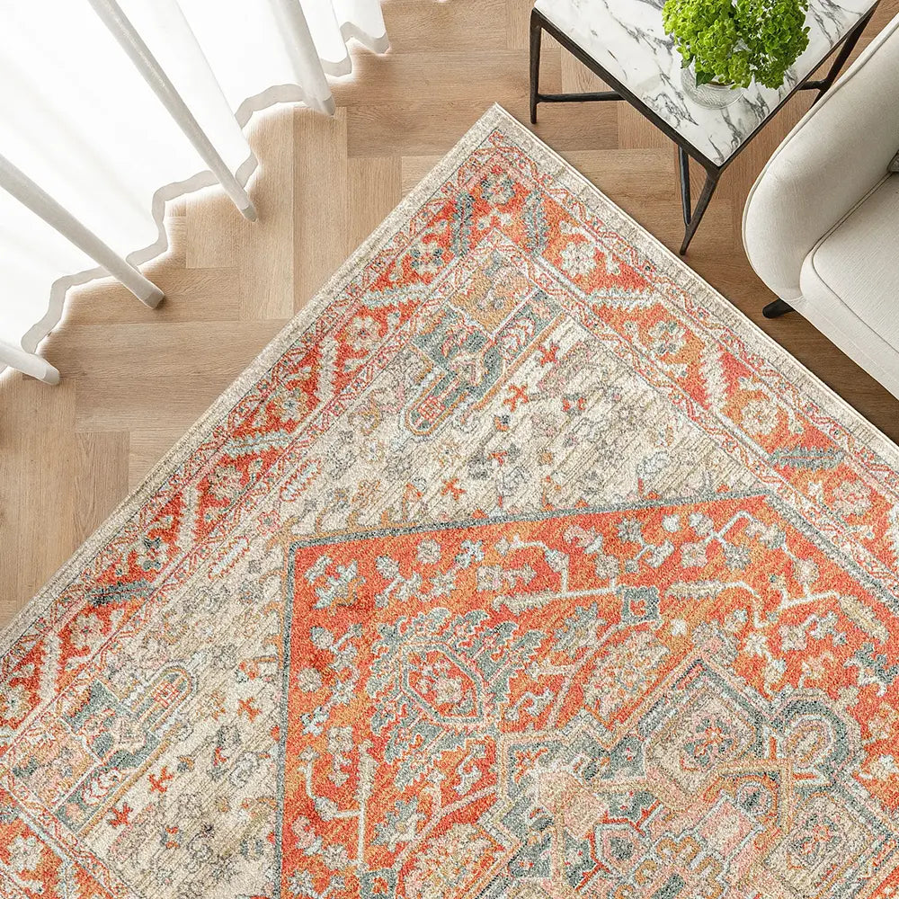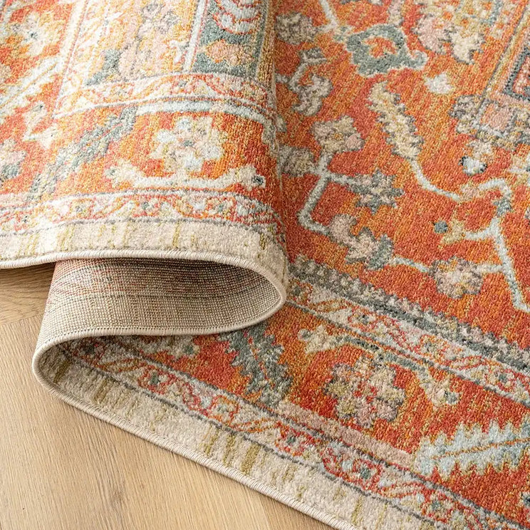 Fresh colours bring this traditional carpet to life. In copper and grey-blue, this medallion rug will brighten up any style of interior, adding a dash of colour without overwhelming your decor.