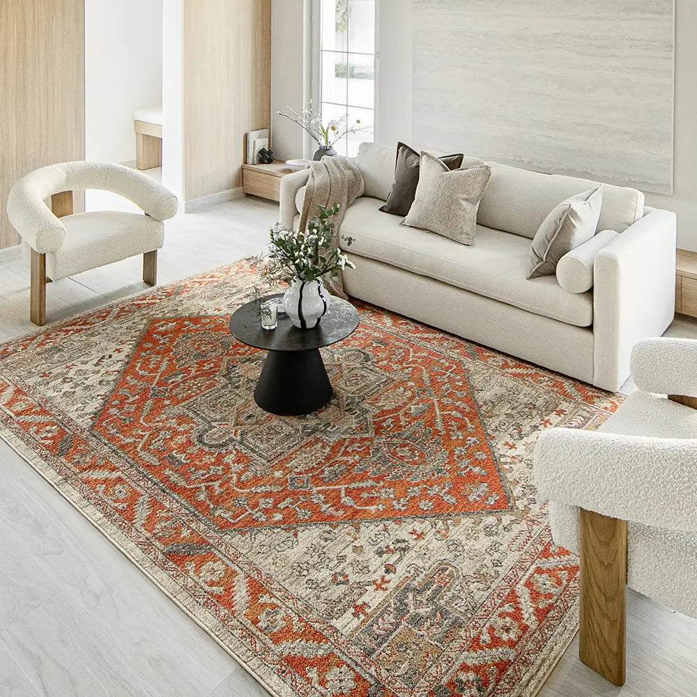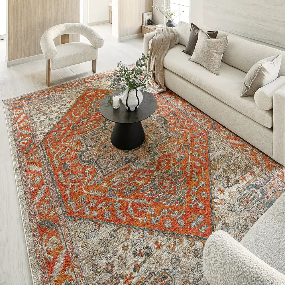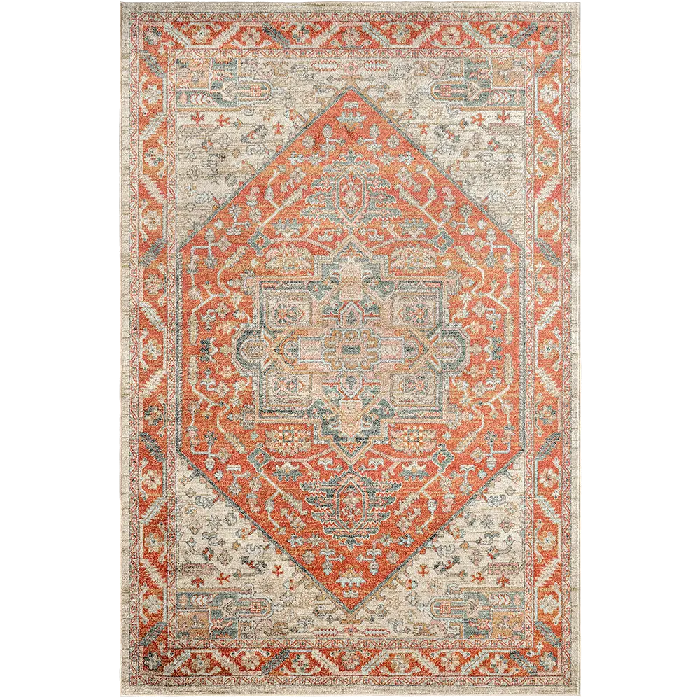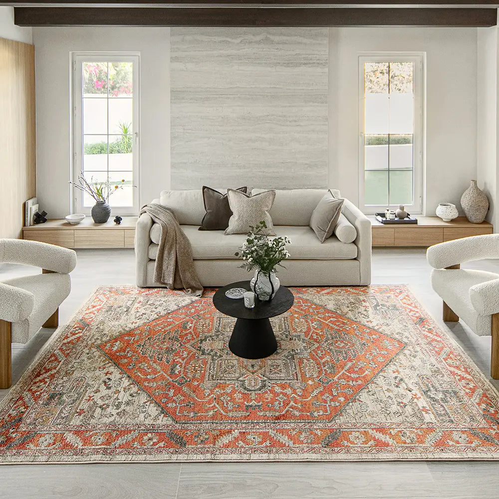 Fresh colours bring this traditional carpet to life. In copper and grey-blue, this medallion rug will brighten up any style of interior, adding a dash of colour without overwhelming your decor.