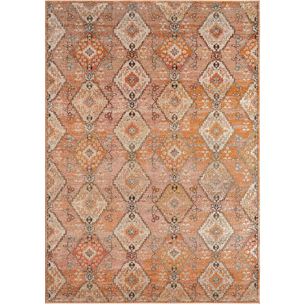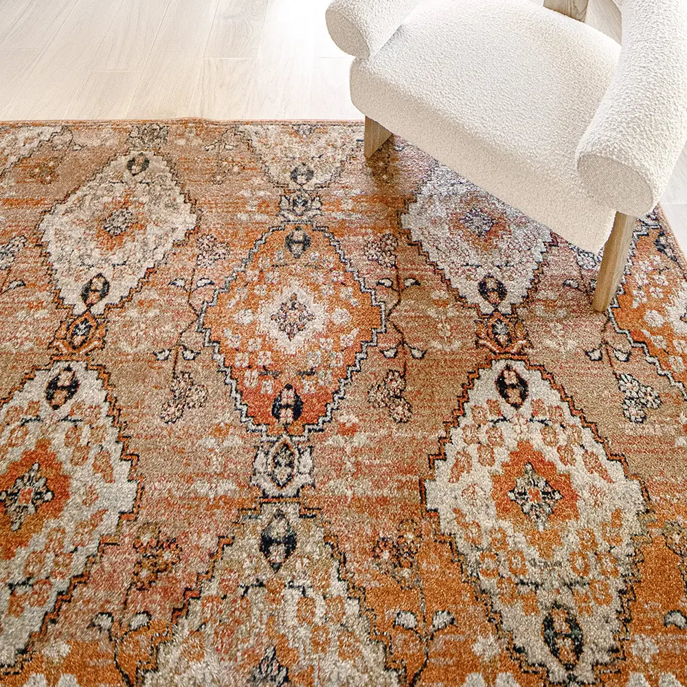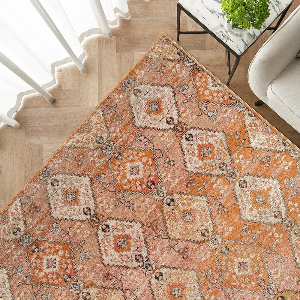 In rich shades of orange, this diamond patterned carpet has a beautiful glow. The vintage style carpet updates traditional design with modern materials to create a warm, inviting aesthetic in your home.