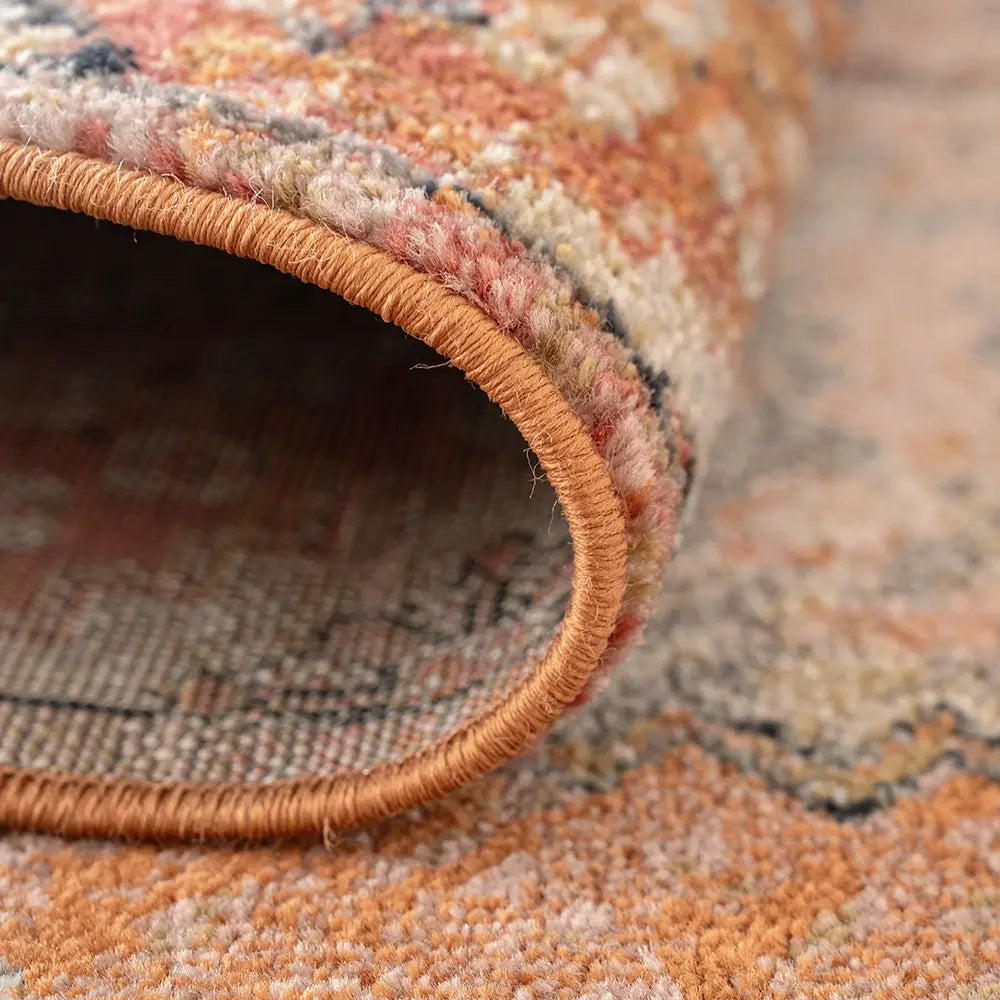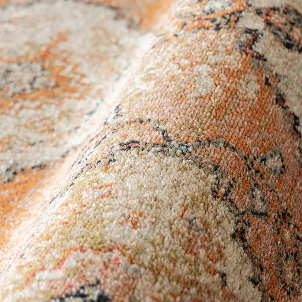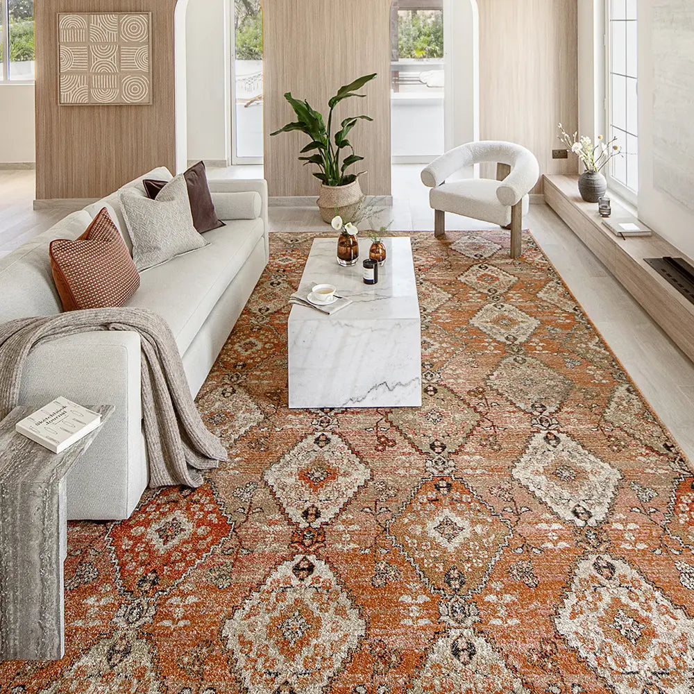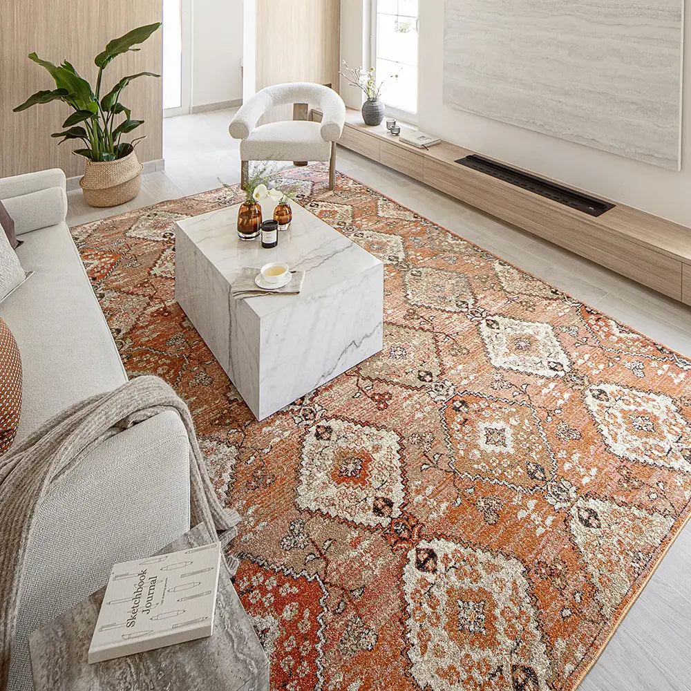 In rich shades of orange, this diamond patterned carpet has a beautiful glow. The vintage style carpet updates traditional design with modern materials to create a warm, inviting aesthetic in your home.