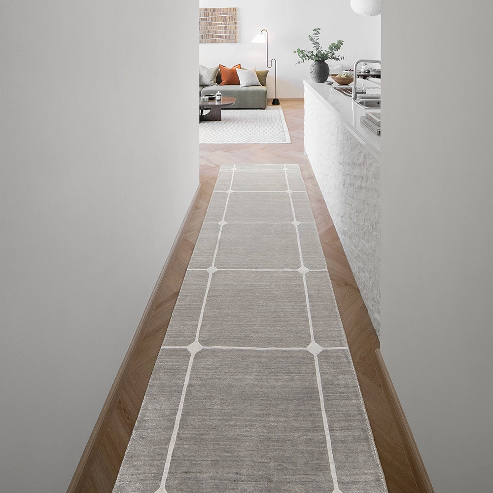 A large-scale grid pattern lends a modern twist to this neutral carpet. In understated shades of grey and ivory, it has a hint of shine to make it an instant upgrade for your home.