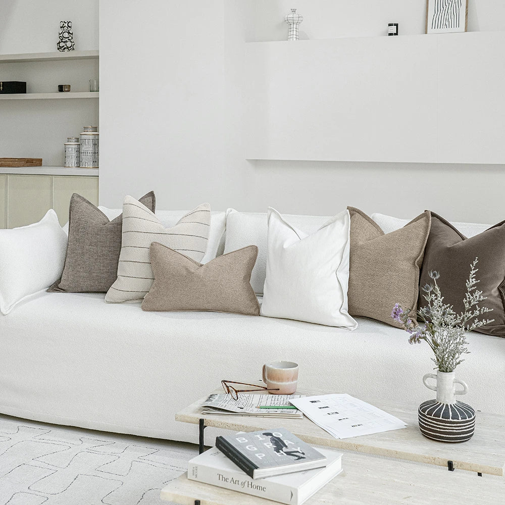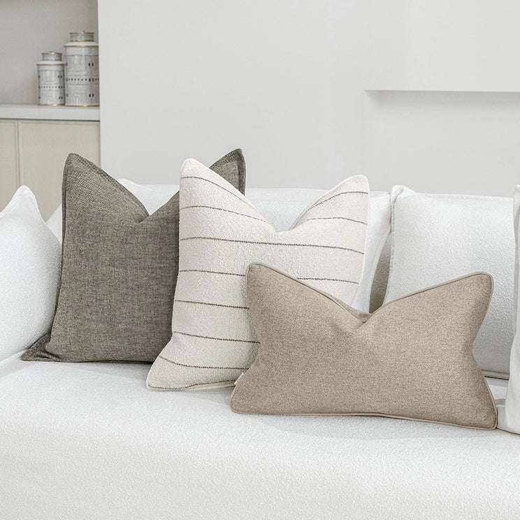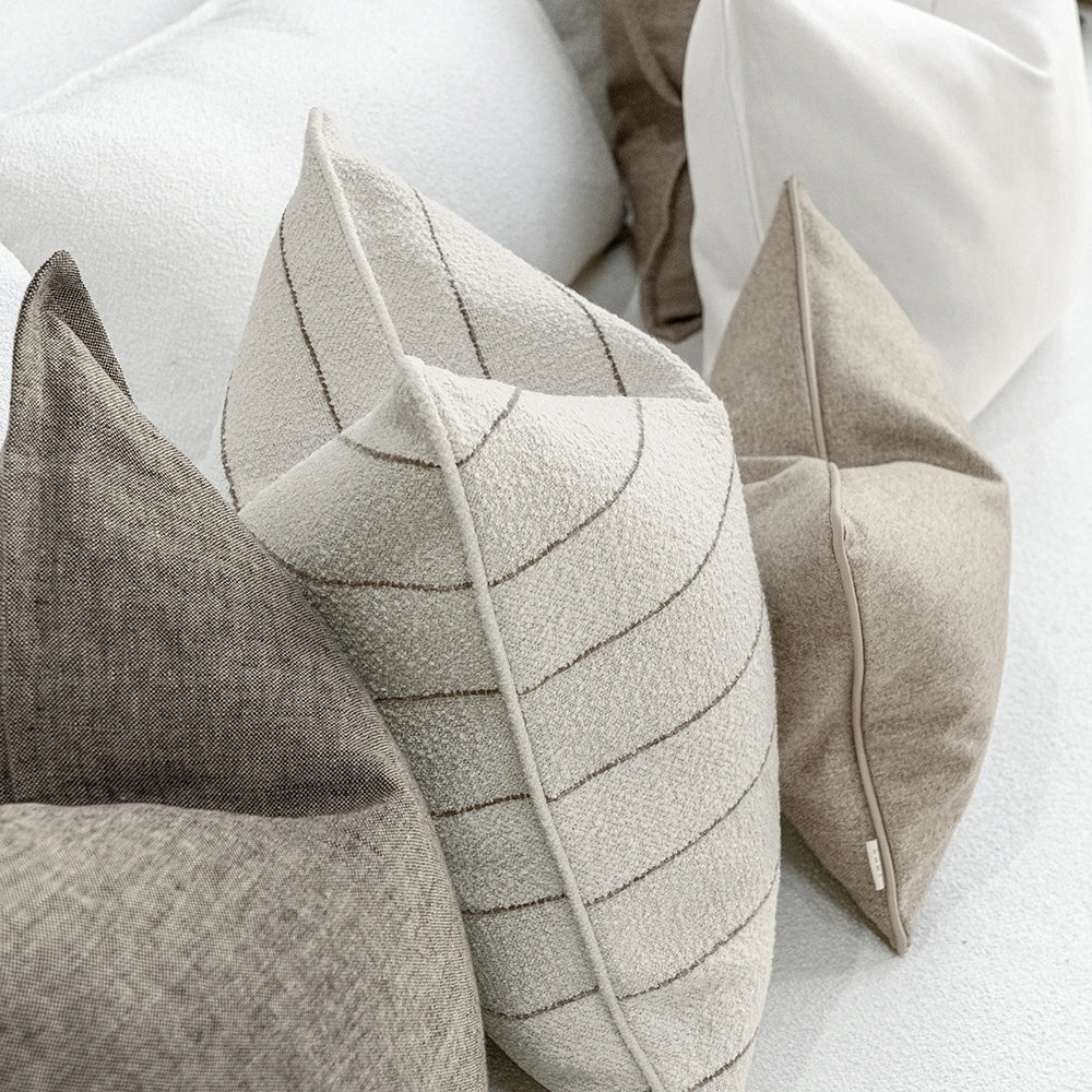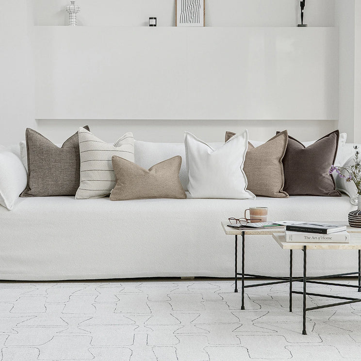 Earthy mix of grey, brown, ivory and taupe cushions with striped and velvet designs adding depth to the final display. An effortless way to complete your lounge seat grouping.
