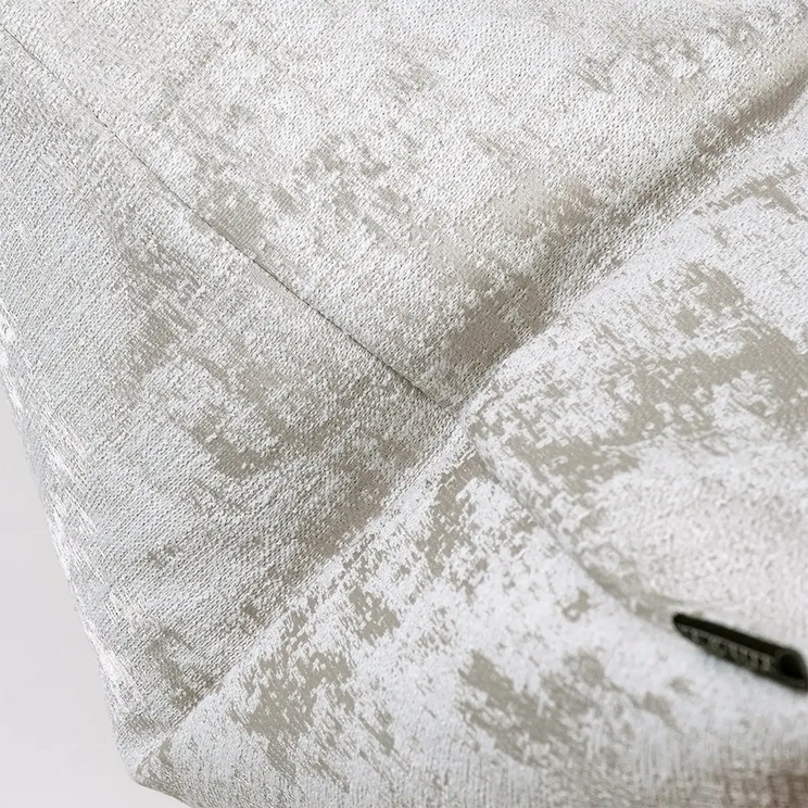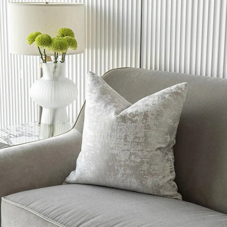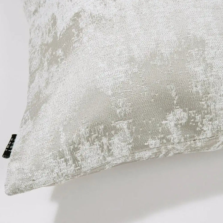 This semi-shiny cushion has been expertly faded and distressed for a vintage-inspired aesthetic, with muted tones of grey and silver giving it a modern twist.