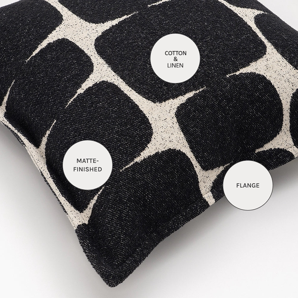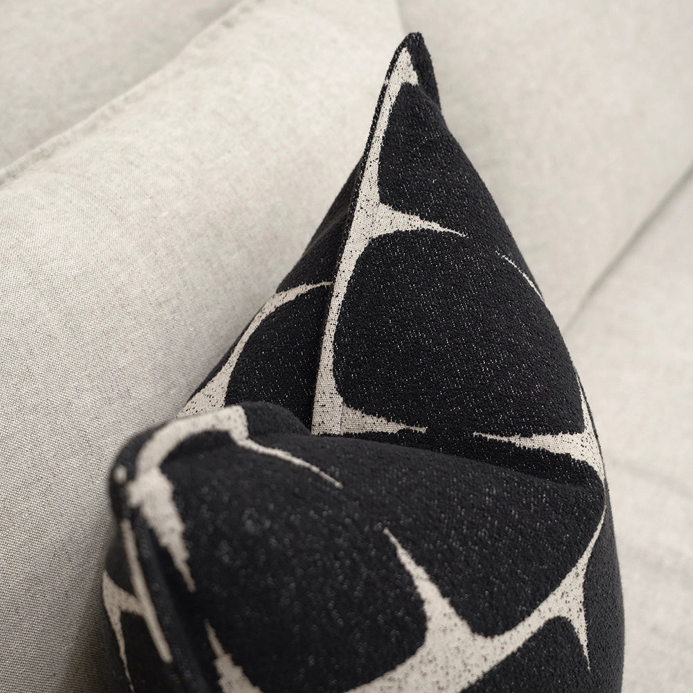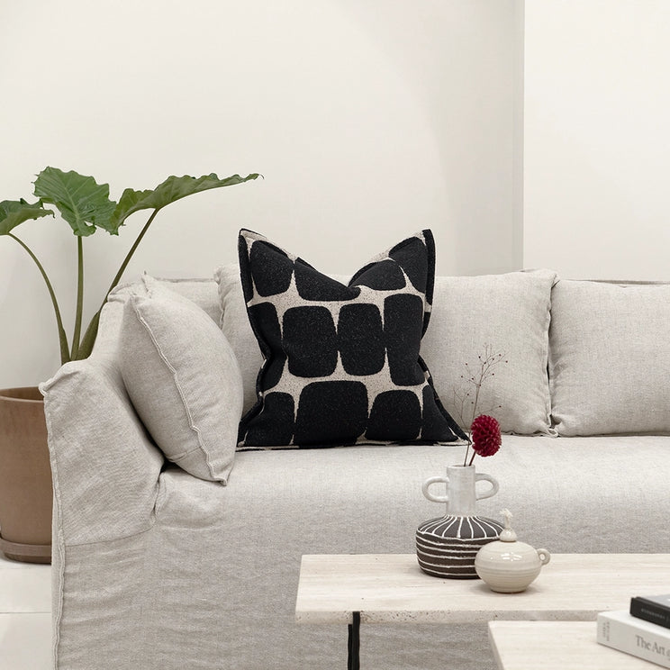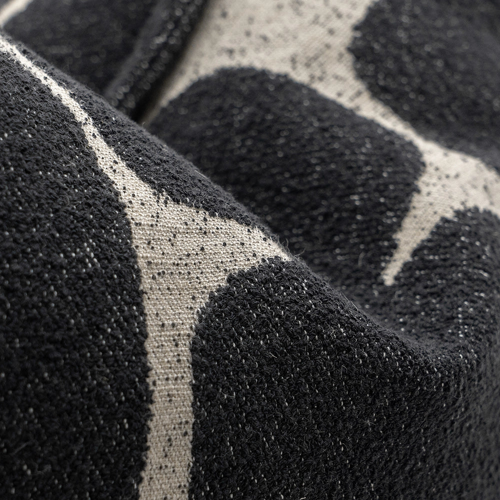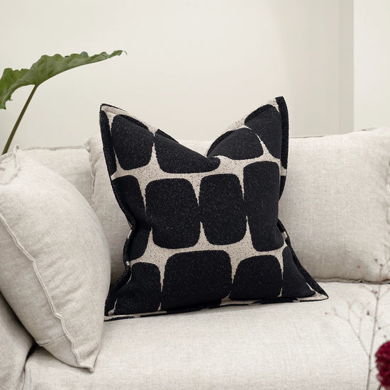 A textured cushion in a rich charcoal tone paired with soft ivory accents. Its bold pattern brings quiet drama to any space while the relaxed edging keeps the mood modern and effortless.
