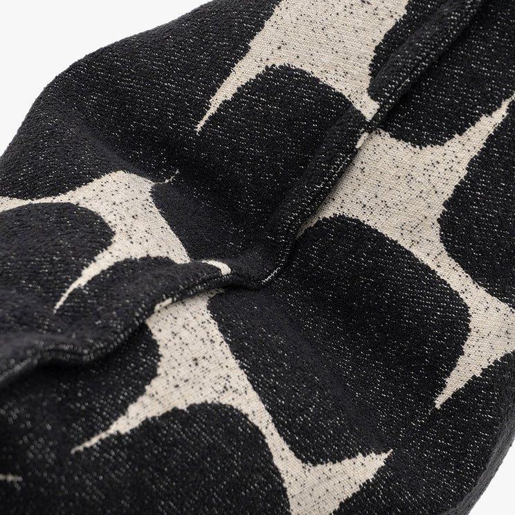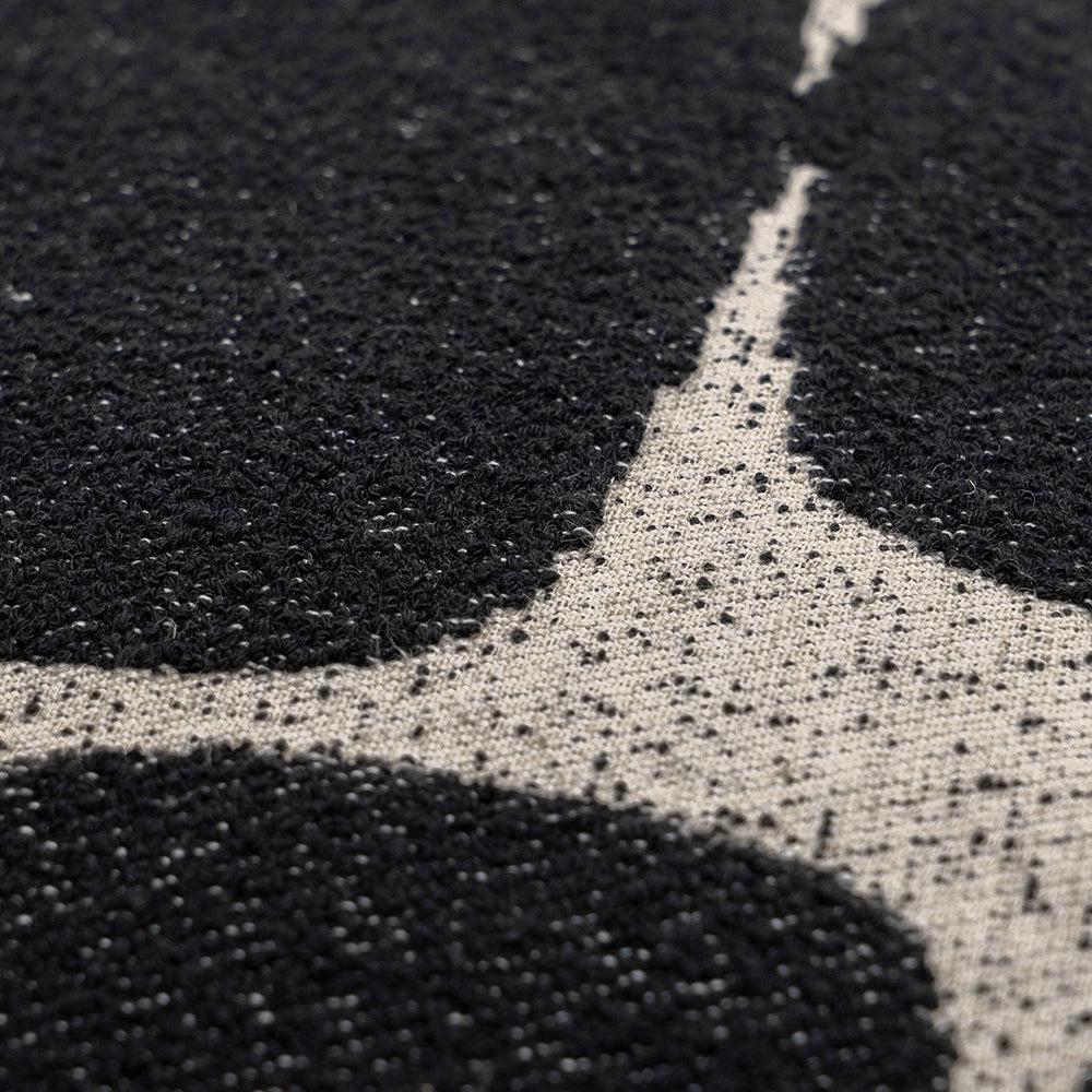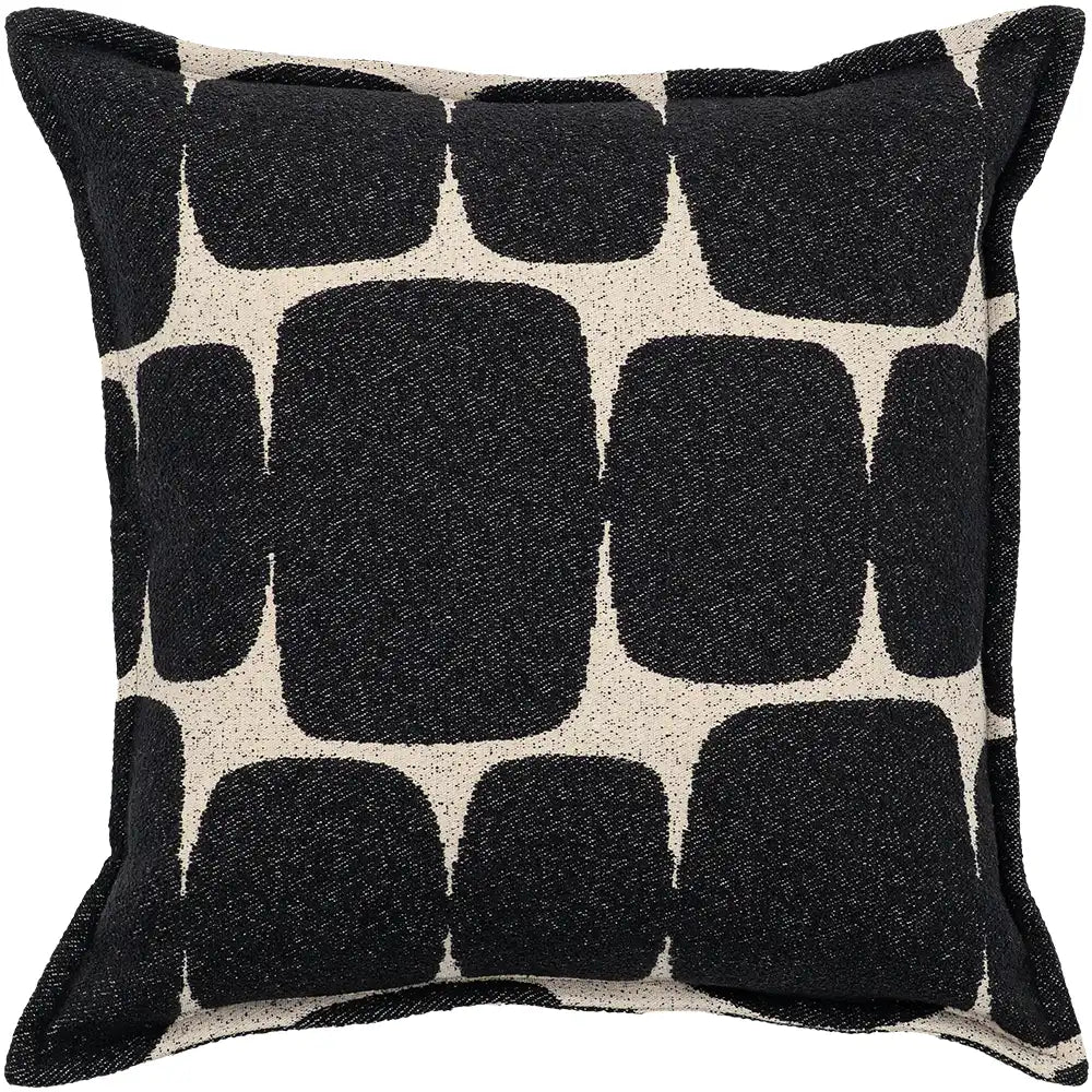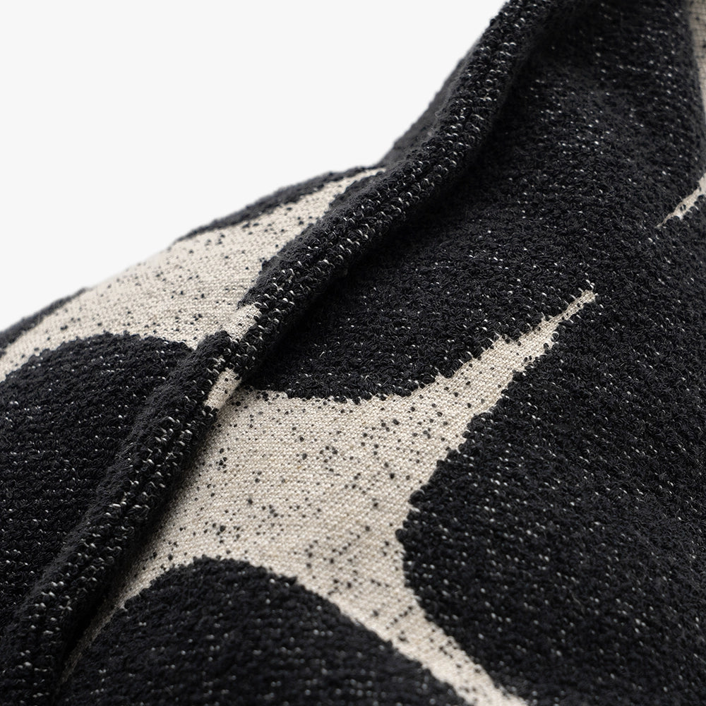 A textured cushion in a rich charcoal tone paired with soft ivory accents. Its bold pattern brings quiet drama to any space while the relaxed edging keeps the mood modern and effortless.
