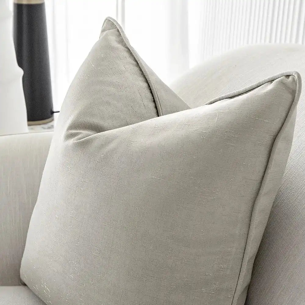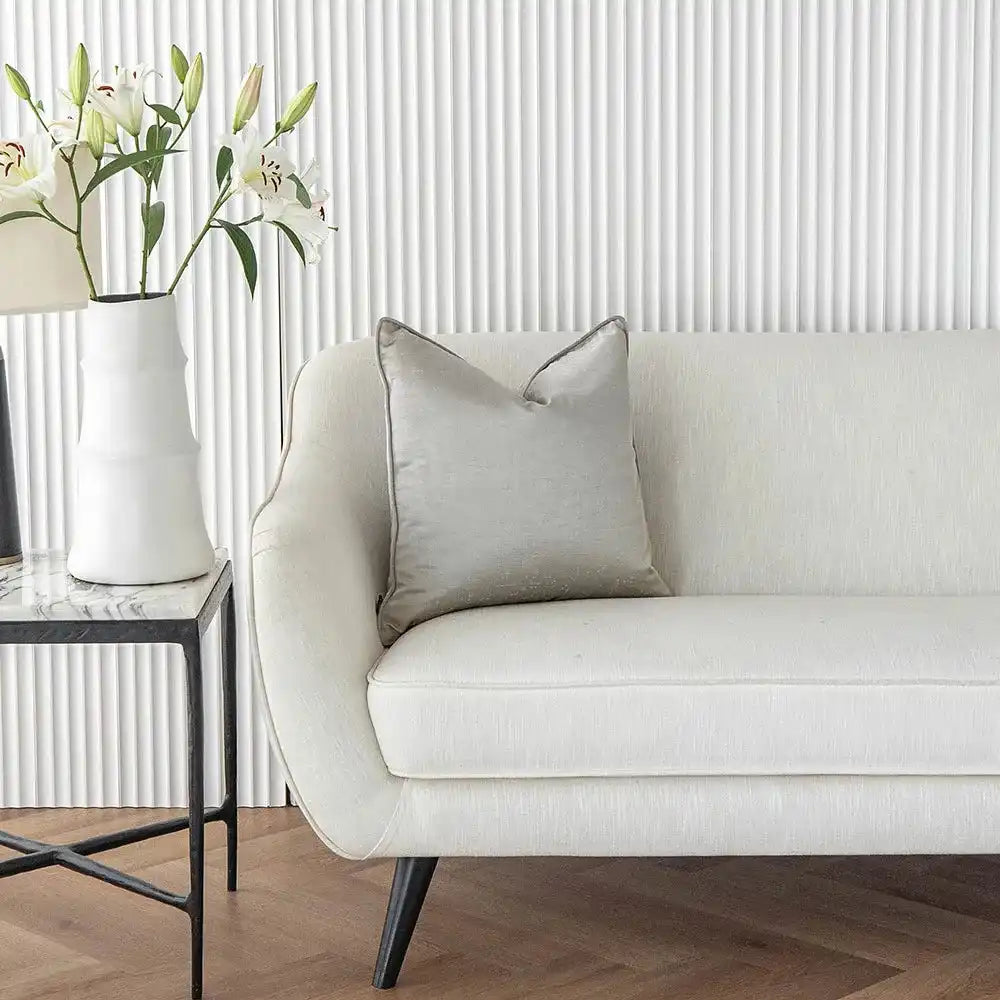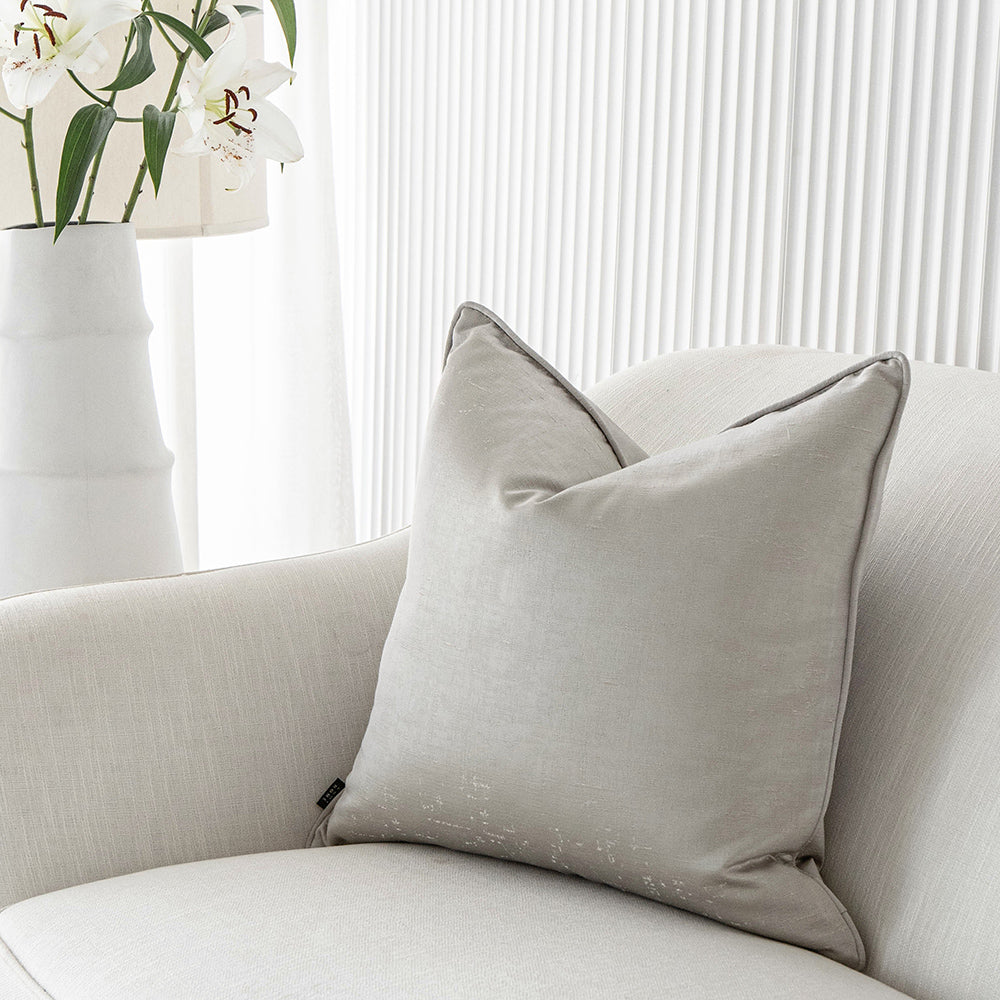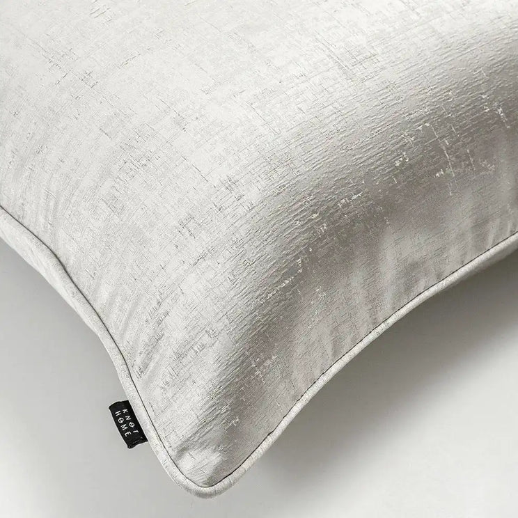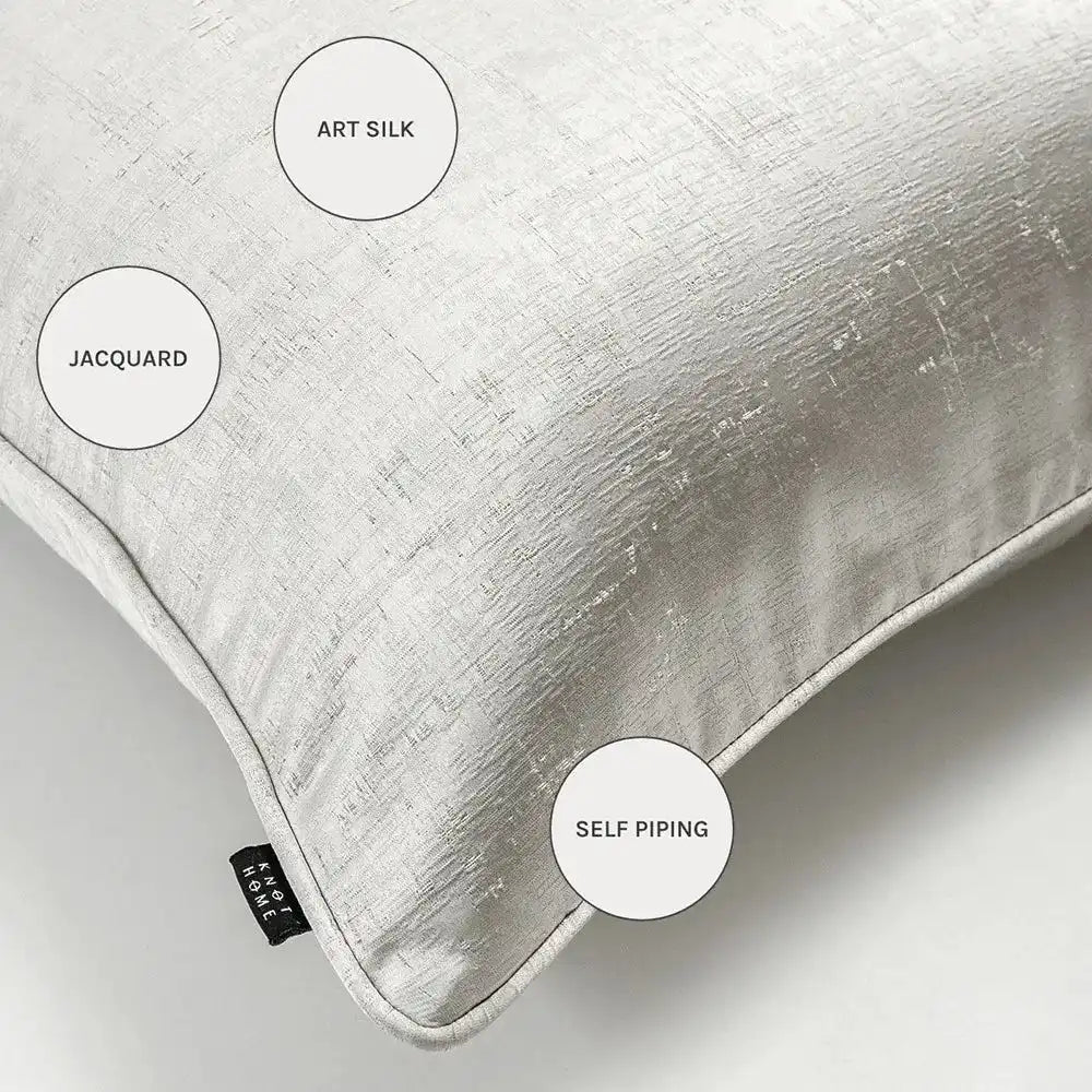 An elegant choice for your sofa, this shiny cushion comes in metallic silver with a faded criss-cross pattern for a vintage touch. The silver cushion is finished with self-piping for a modern finish.