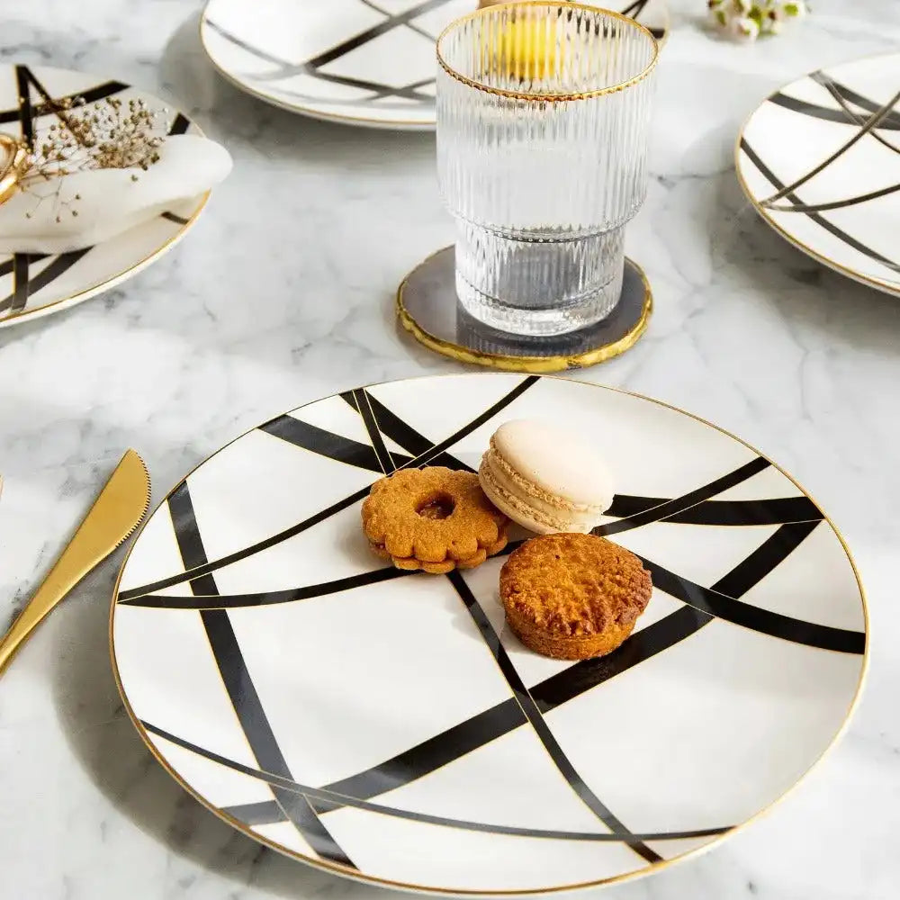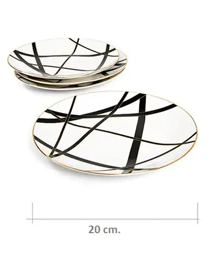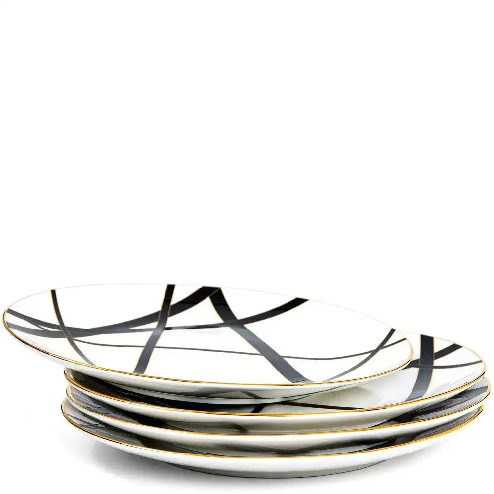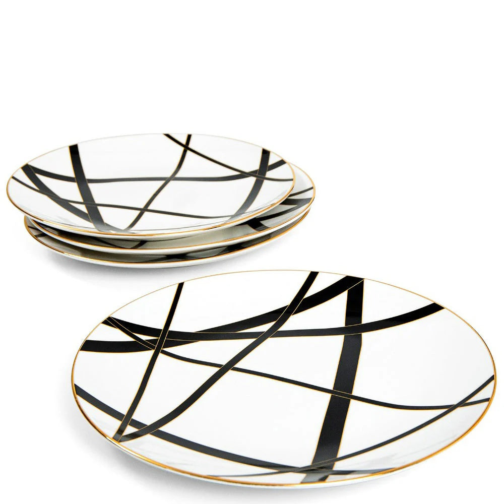 Made from bone china and painted by hand, this set of four plates will bring luxury to your table. The plates have a black criss-cross pattern on a white base, with a gold rim for an opulent touch.