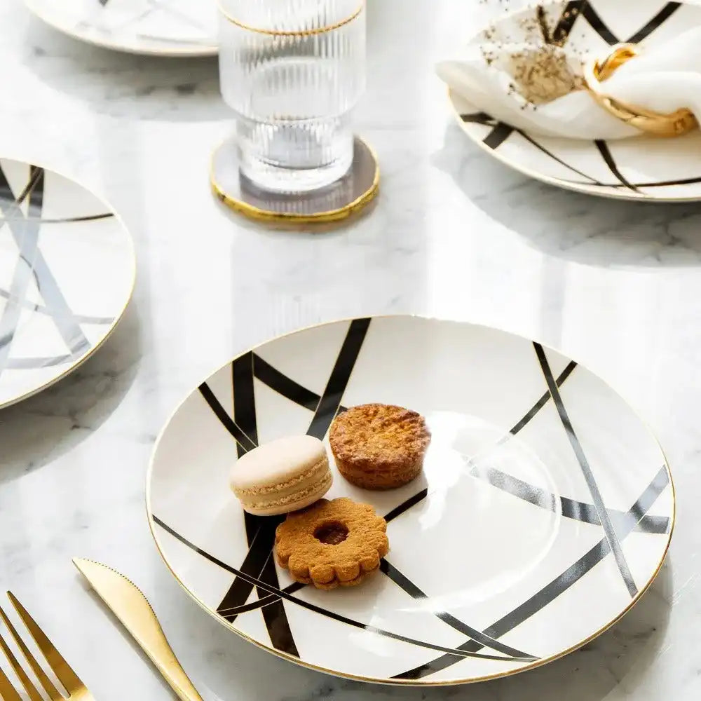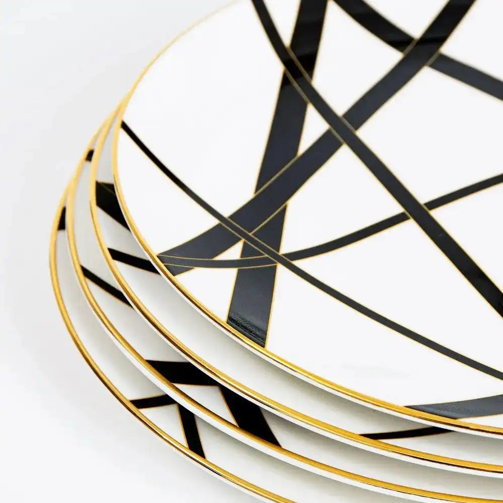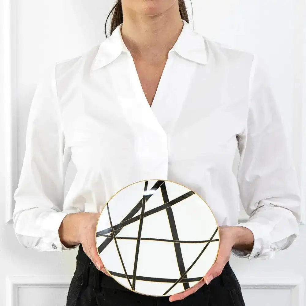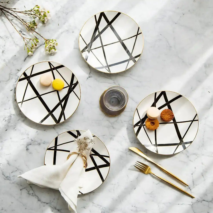 Made from bone china and painted by hand, this set of four plates will bring luxury to your table. The plates have a black criss-cross pattern on a white base, with a gold rim for an opulent touch.