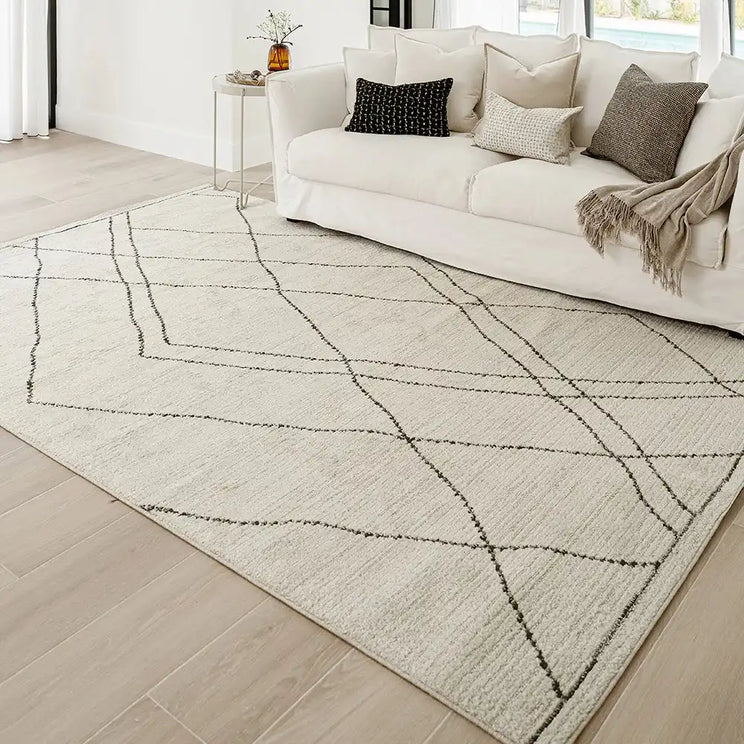Irregular lines create a diamond pattern across this ivory and beige carpet – a chic choice for any room in your home.