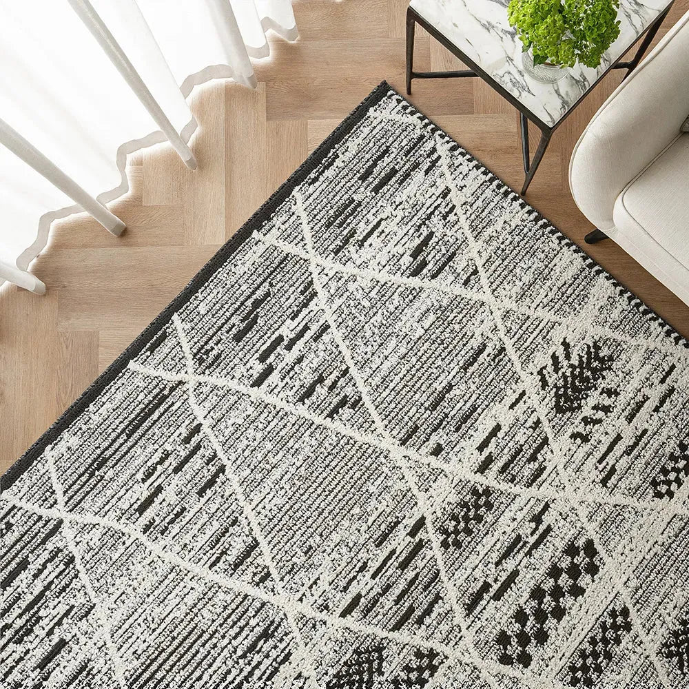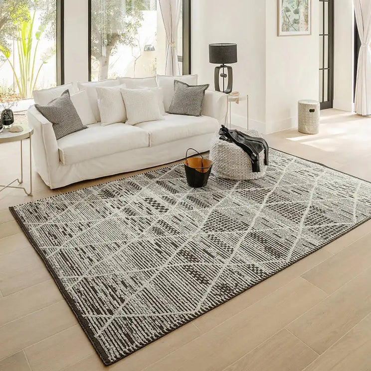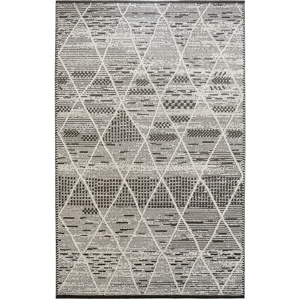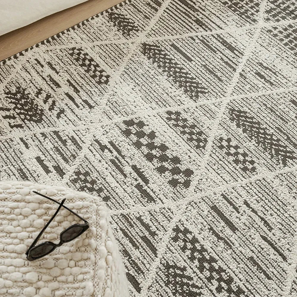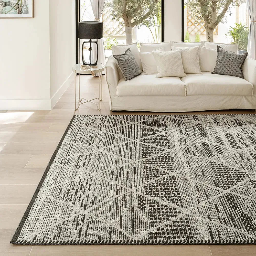 A diamond pattern dances all over this distressed carpet. In chic shades of charcoal and ivory, it will complement a modern interior beautifully.