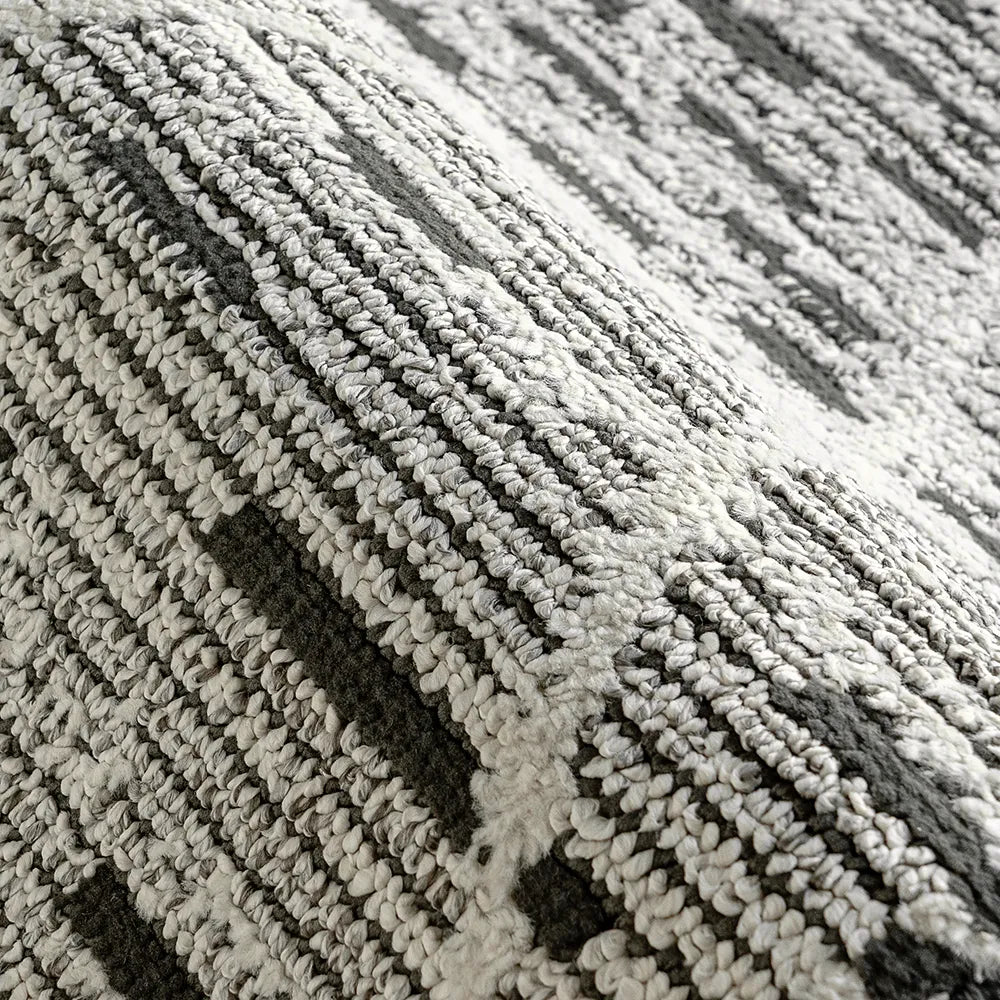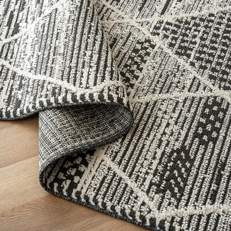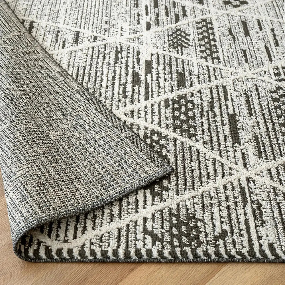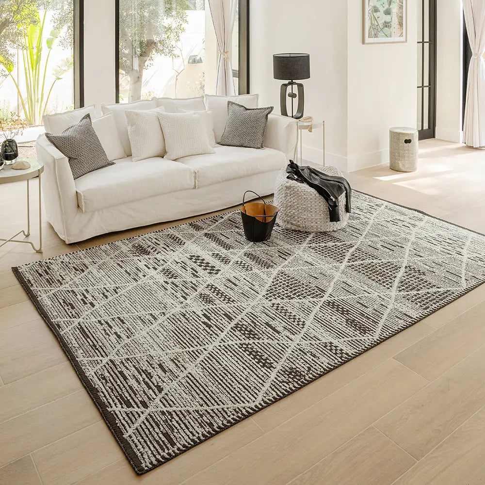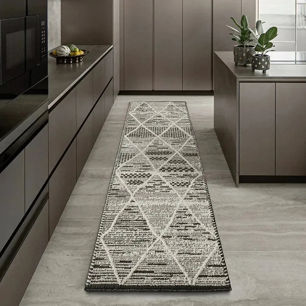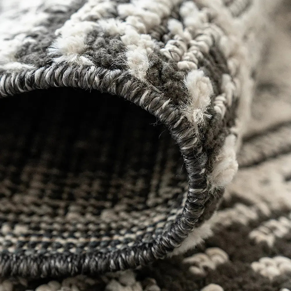 A diamond pattern dances all over this distressed carpet. In chic shades of charcoal and ivory, it will complement a modern interior beautifully.