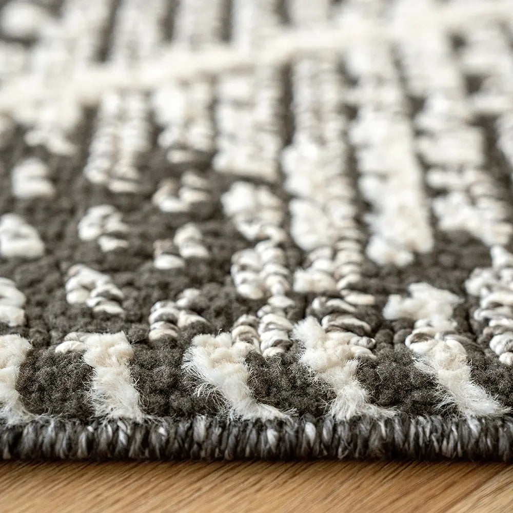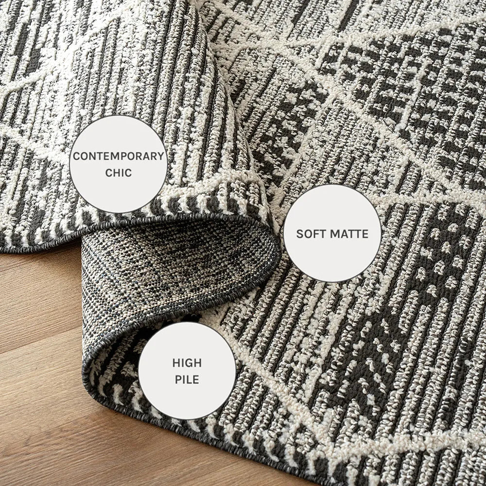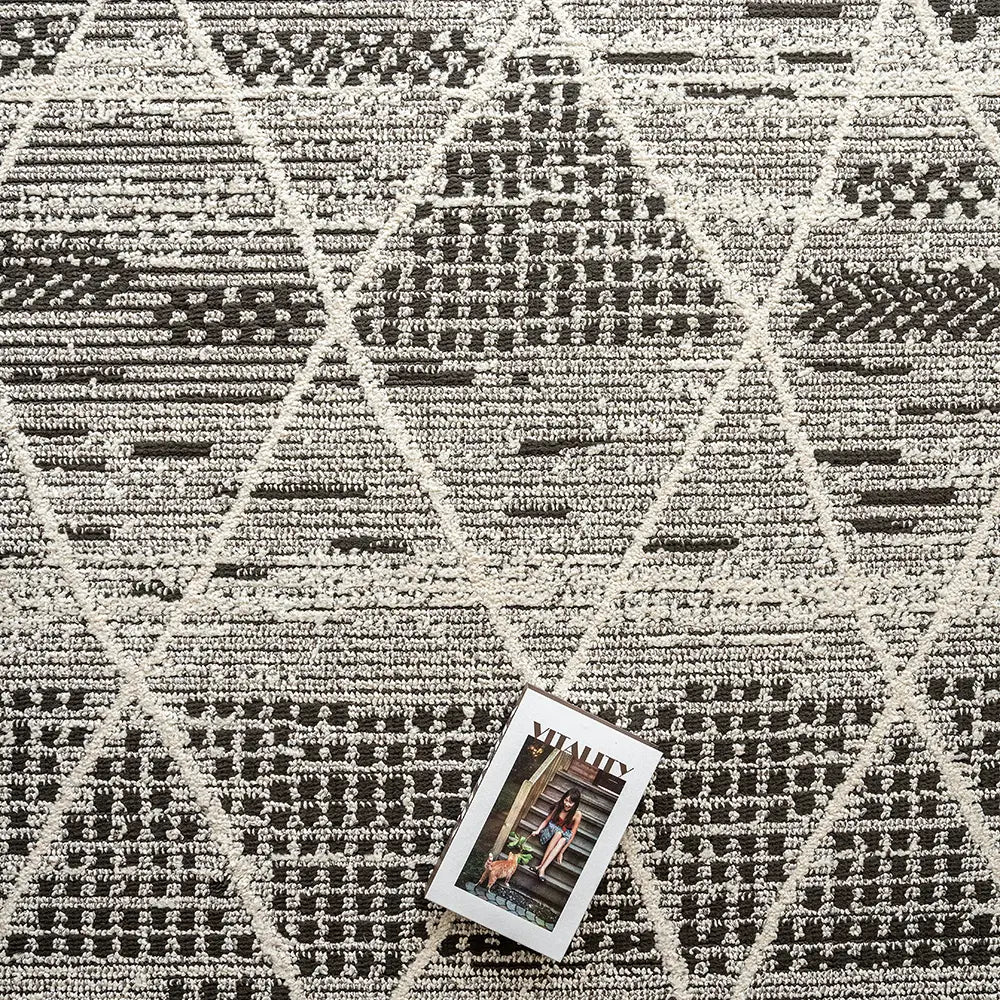 A diamond pattern dances all over this distressed carpet. In chic shades of charcoal and ivory, it will complement a modern interior beautifully.