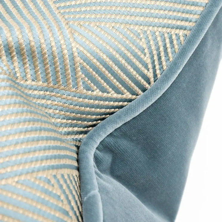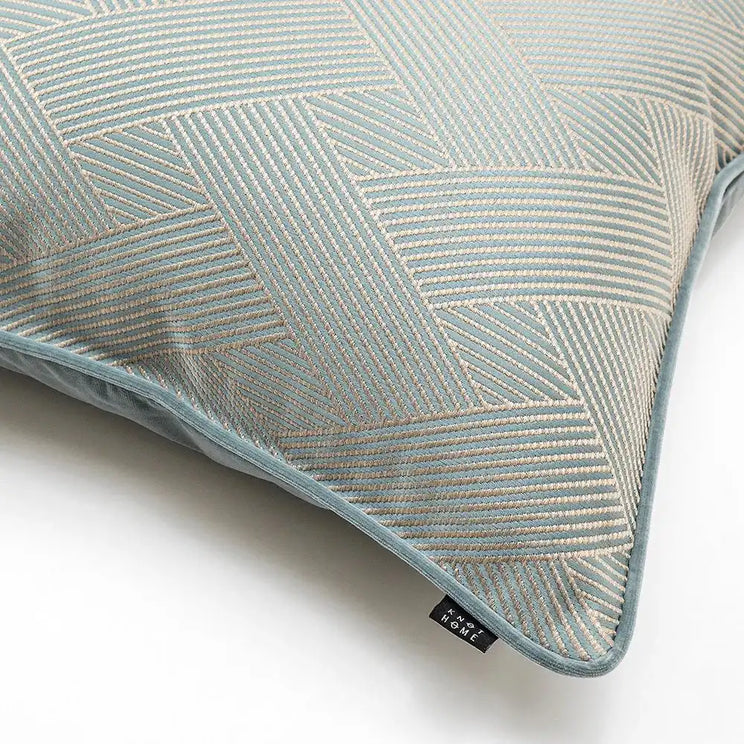 This gleaming blue-green cushion makes a stylish addition to any home. The teal cushion has bands of narrow lines forming a large-scale woven pattern on the front, with a velvet back for contrast.