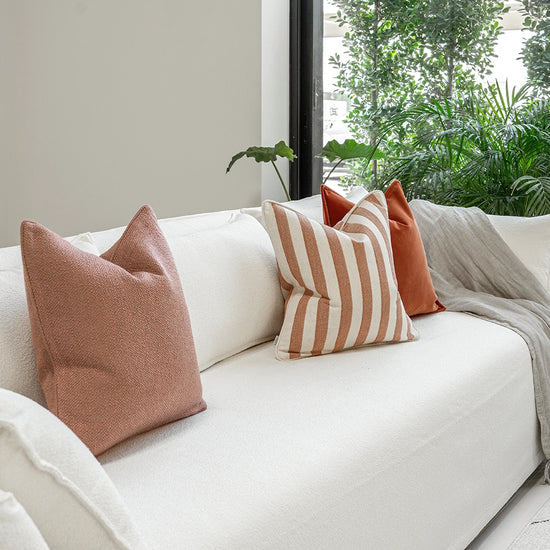 Blush tones create a sweet addition to your décor. This three-piece cushion set includes plain, striped and velvet cushions – together, they add up to a cute and colourful display.