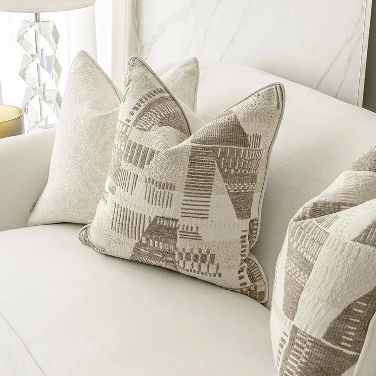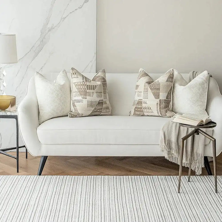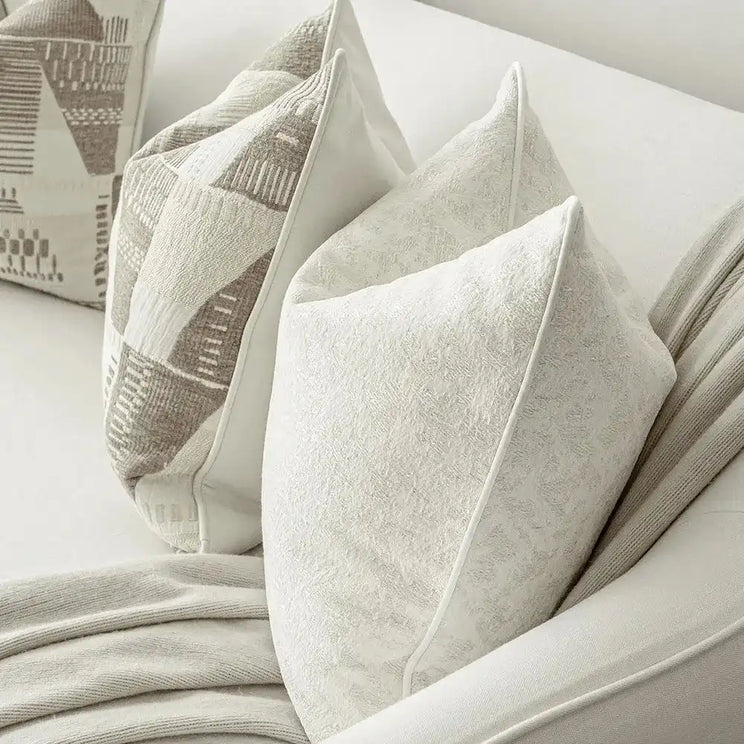 Luxe textures elevate this neutral cushion bundle. Two white and ivory criss-cross pattern cushions are teamed with two eclectic cushions with a textured abstract pattern on the front.