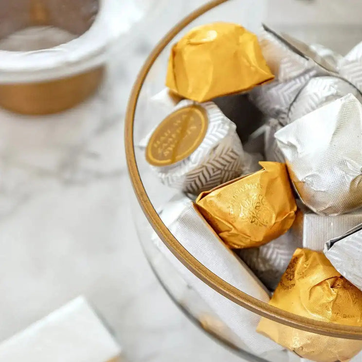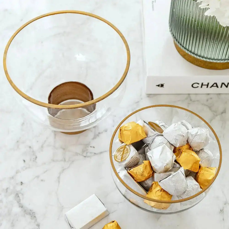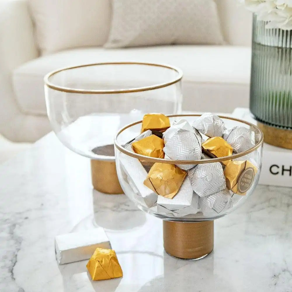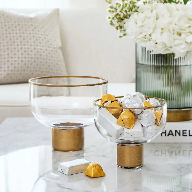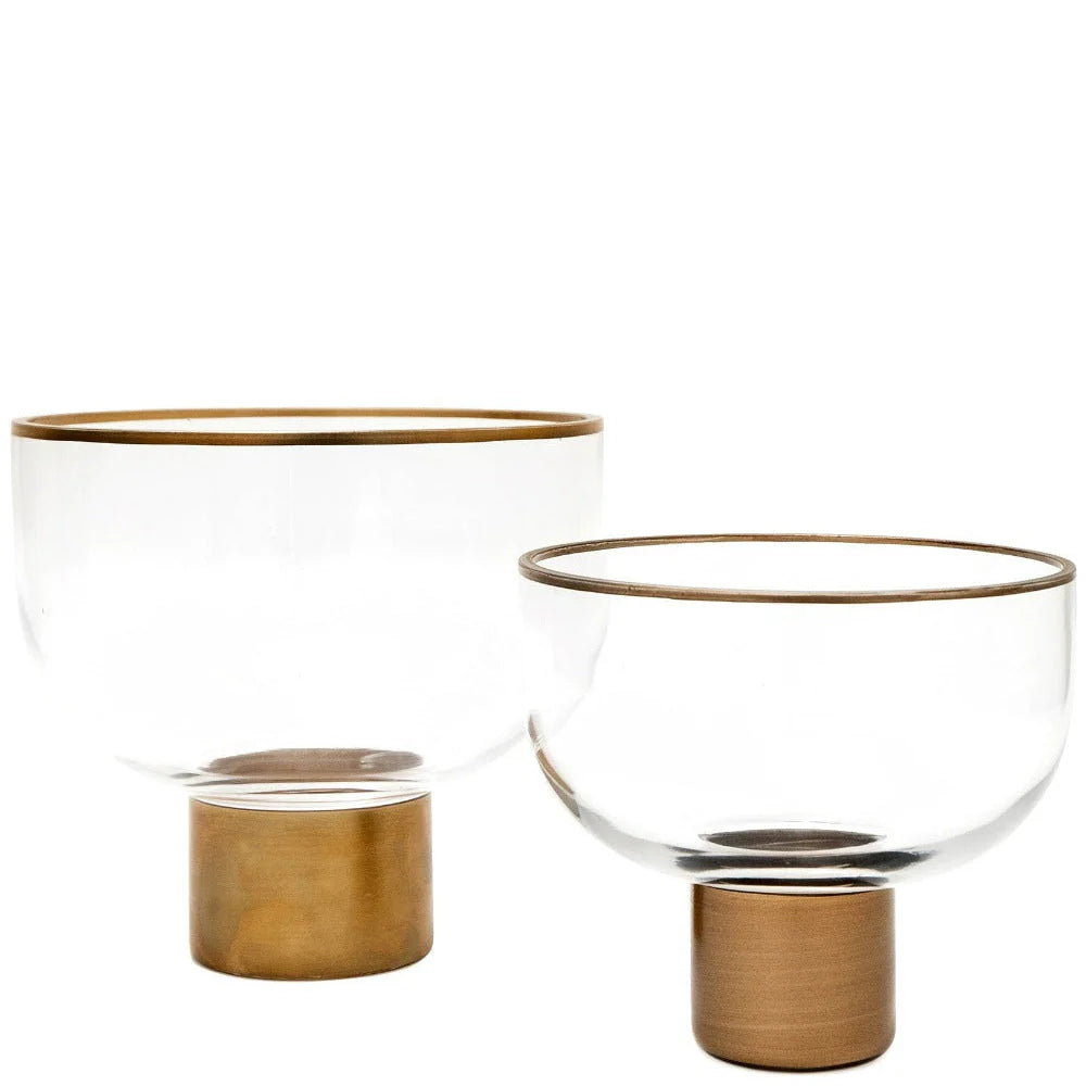 This two-bowl set is one of our best-selling accessories. The Martha storms set includes two small clear glass bowls with brass around the rim and slim brass stands.